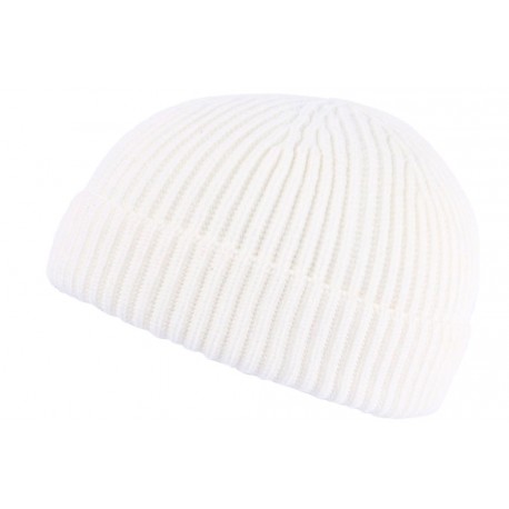 Trouver son bonnet docker femme et homme style tradition et qualité chapellerie modèle Louy White marque Nyls Création, bonnet court blanc en laine douce look hiver fashion et classe en tricot souple et chaud. Bonnet revers pas cher taille unique.