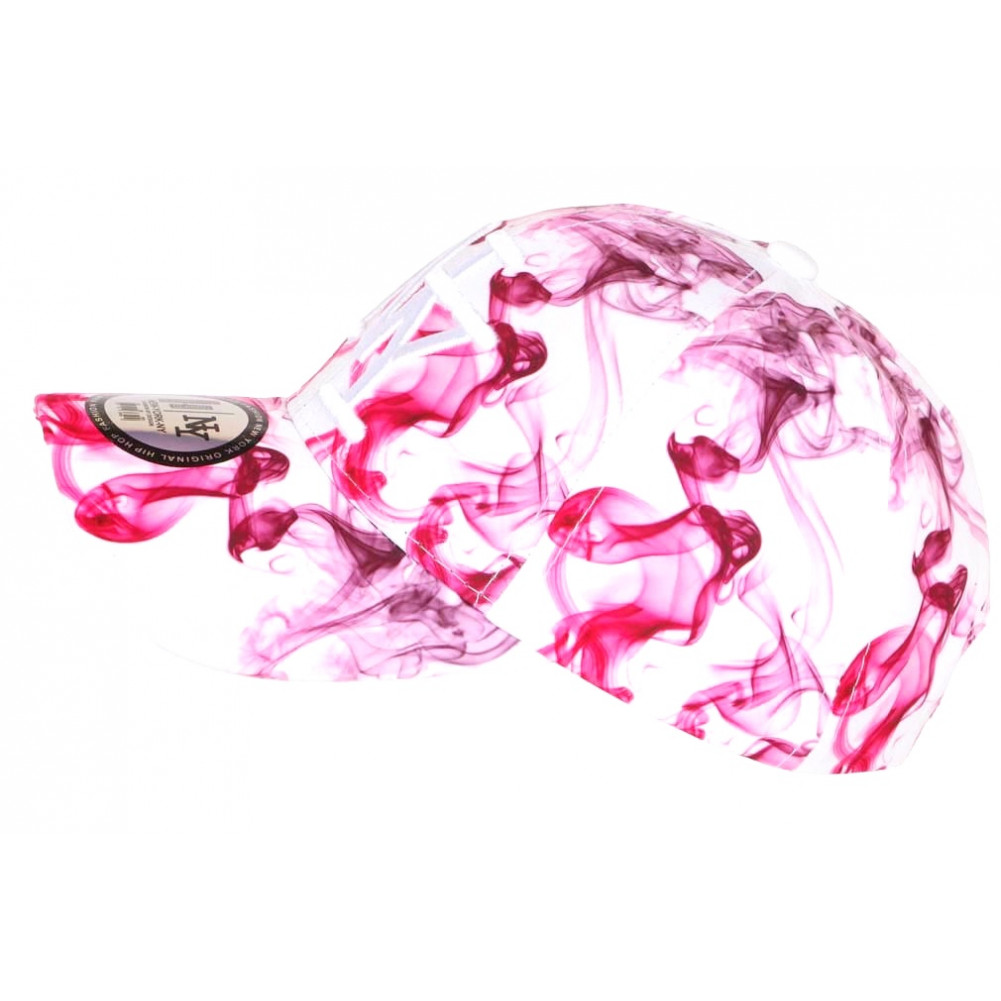 Acheter casquette NY enfant rose et blanche look volutes de fumée tendance modèle Wine Smoky de la collection Hip Hop Honour, casquette fille et garçon streetwear design original et classe, NY en broderie blanche en relief, visière baseball tendance et sticker New York Original argent, taille 7 à 11 ans.