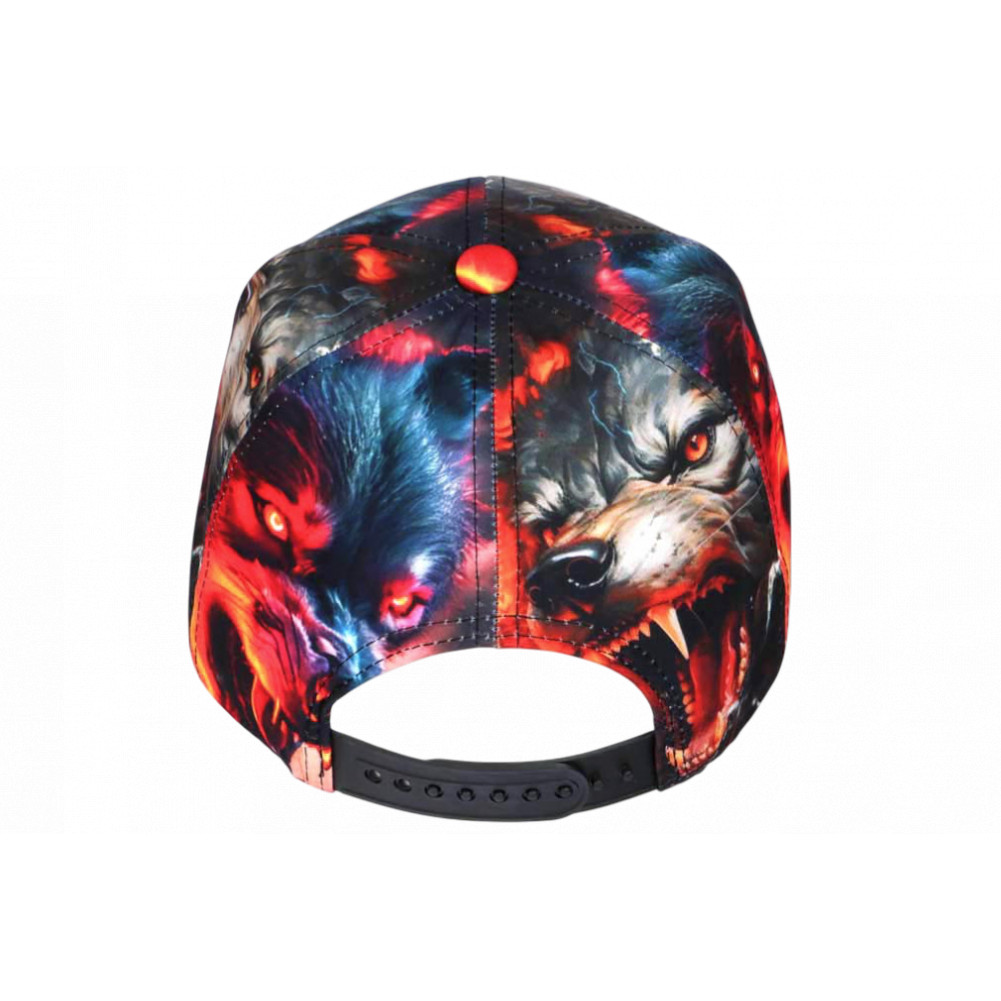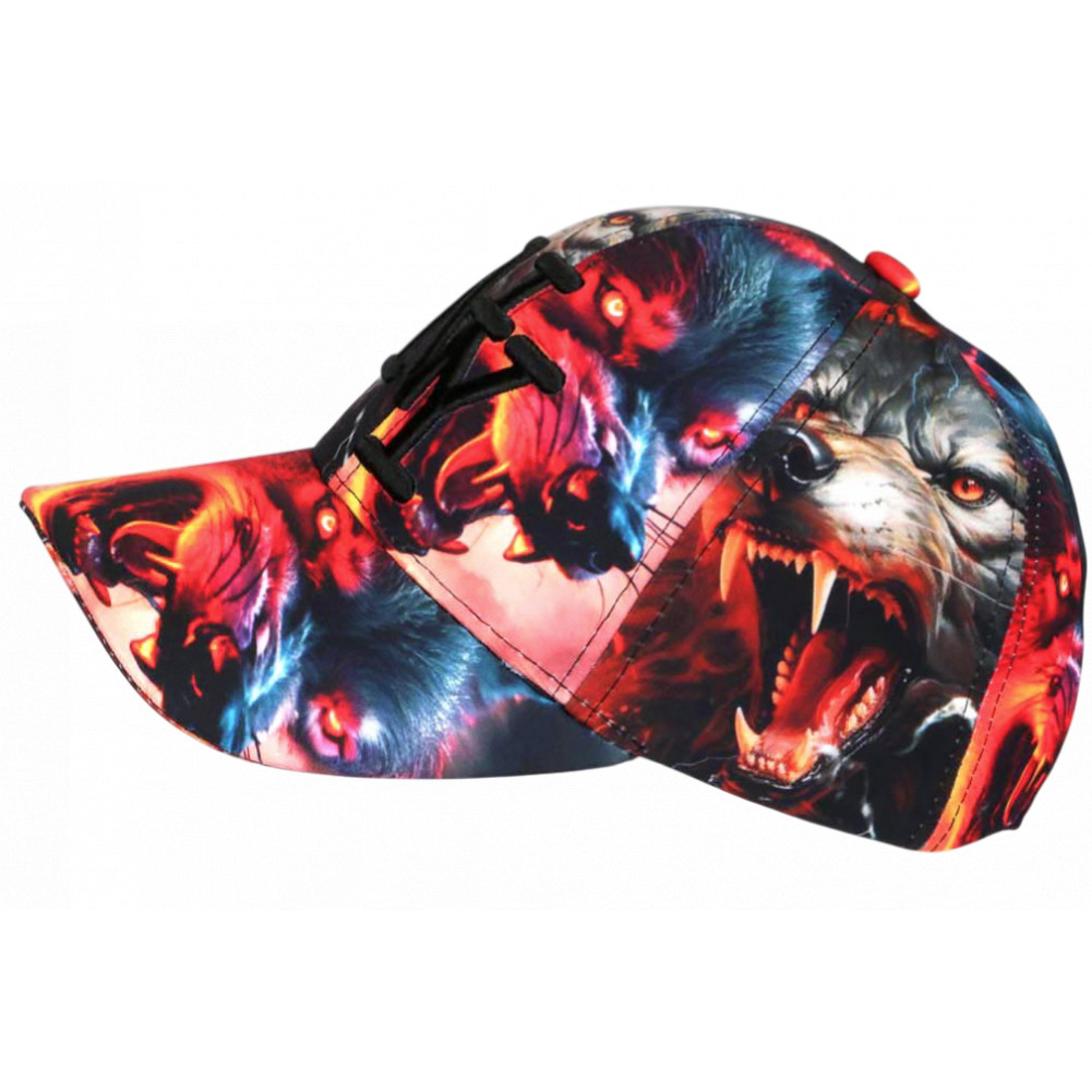 Vente en ligne casquette loup garçon et fille originale création Hip Hop of Honour modèle Blood Wolf fabriquée en tissu aux motifs de gueules de loups aux yeux vifs et et crocs menaçants dans une ambiance rouge, orange et bleue façon ténèbres brûlants. Cette jolie casquette NY enfant originale mode terrifiante est montée d'une visière ronde avec l'irremplaçable griffe NY de New York city brodé en noir brillant couture 3D pour une qualité de fabrication soignée. Design travaillé et moderne, la taille de cette casquette pour enfant originale se règle rapidement par une attache de plastique noir souple et sera parfaite pour les tailles de 7 à 12 ans.