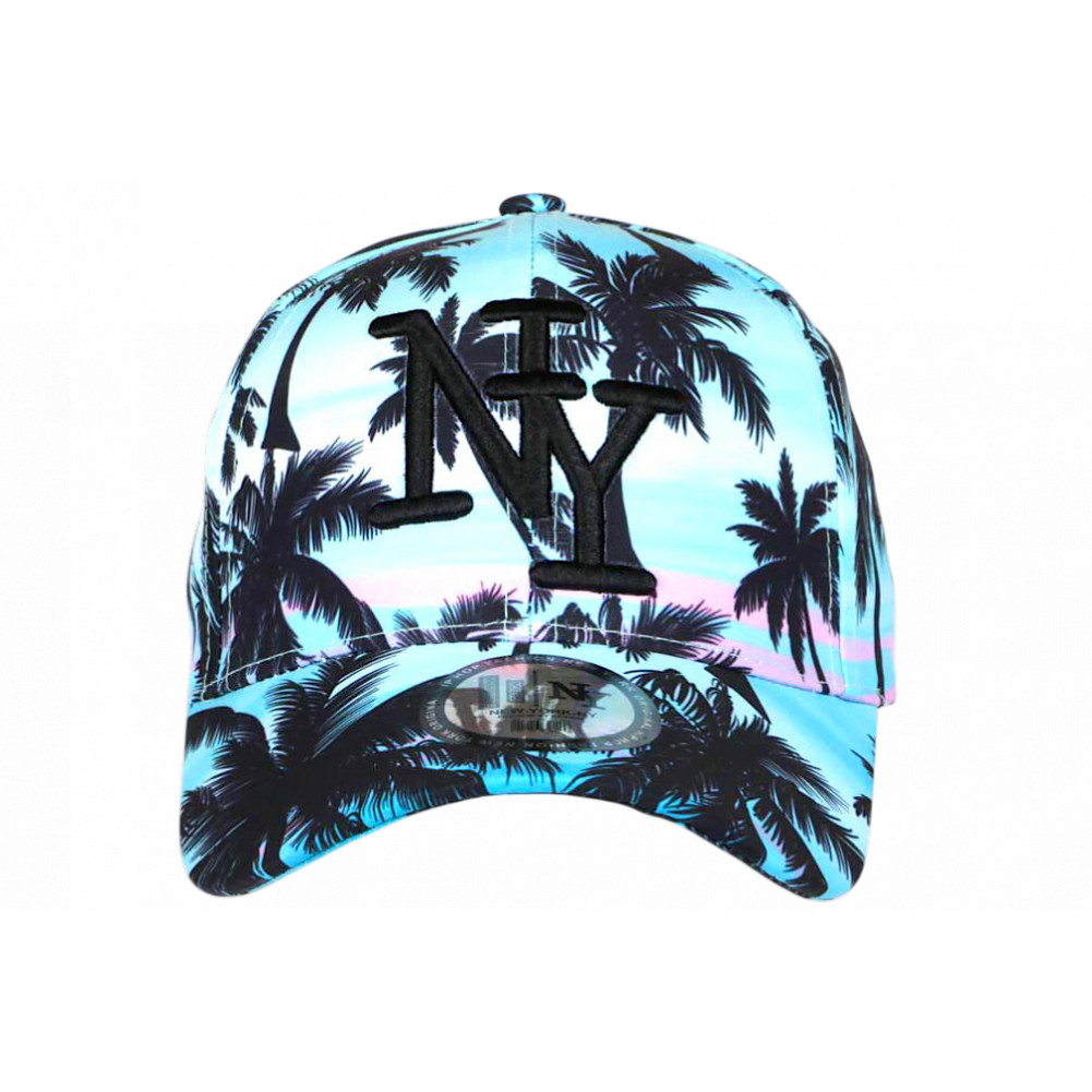 Choisissez en ligne une casquette NY Enfant turquoise Palmiers noirs imprimé tropical dans un coucher de soleil rose en dégradé référence Pretty Sunset marque Hip Hop Honour, casquette baseball fille et garçon exotique et fantaisie, visière ronde tendance, brodée NY noir en relief chic, sticker gris New York Original, taille enfant de 7 à 12 ans.