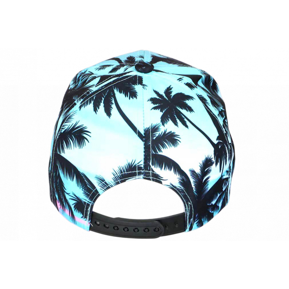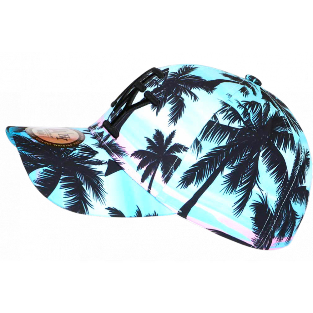 Vente casquette enfant pas cher originale présentée par Hip Hop of Honour modèle Pretty Sunset mode été fashion avec des motifs de palmiers noirs sur un fond turquoise en dégradé rose façon coucher de soleil pour une mode douce et vacances. La calotte de cette casquette garçon et fille fantaisie est brodée de l'indispensable griffe NY de New York City en noir brillant couture 3D pour une confection chic et un jeu de couleurs douces, harmonieuses et streetwear. L'autocollant argent et noir rond New York Original est placé sur la visière baseball mode. La taille de cette casquette enfant tendance turquoise et rose s'ajuste avec facilité et précision par la languette bleu marine cousue à l'arrière et sera parfaite pour les tailles de 7 à 12 ans.