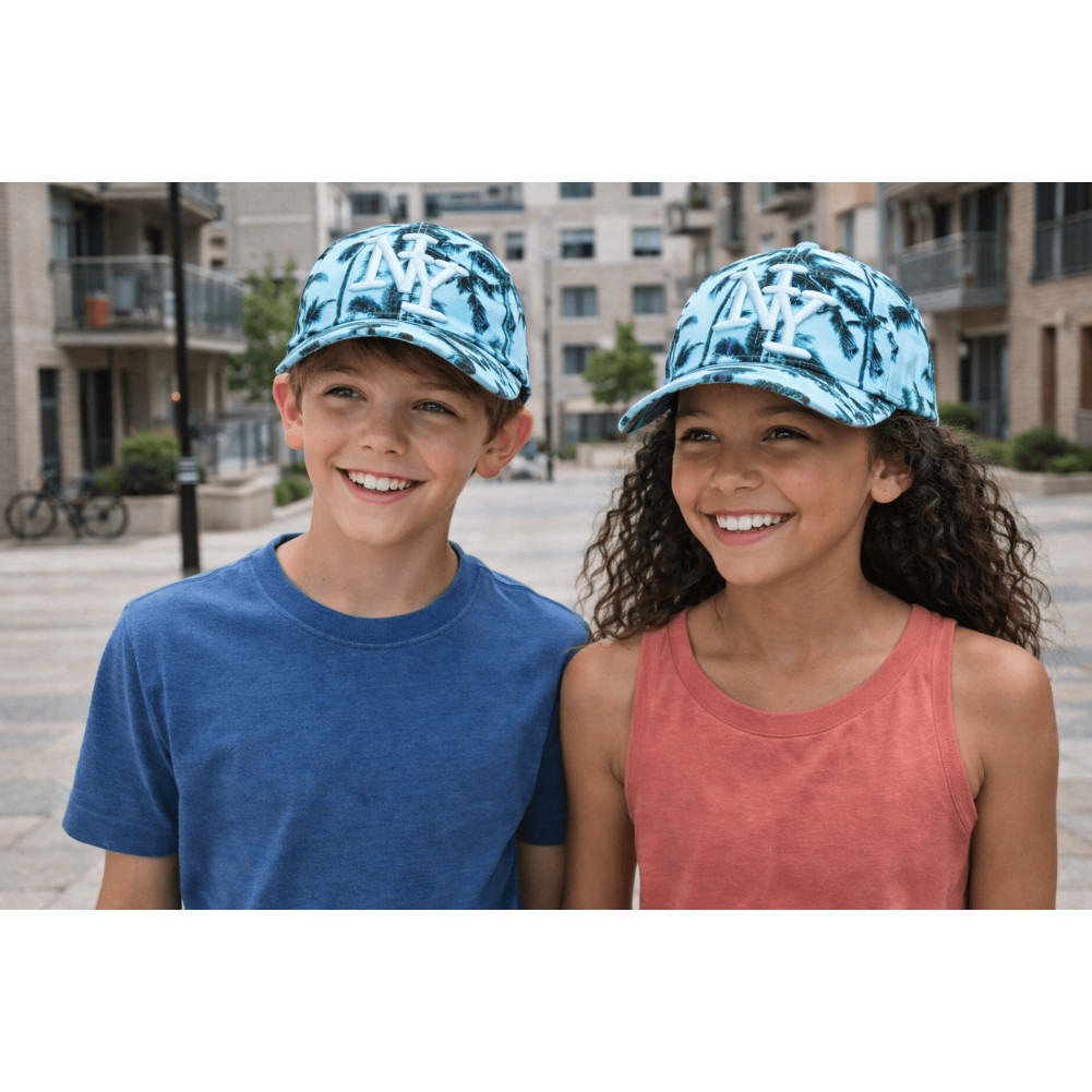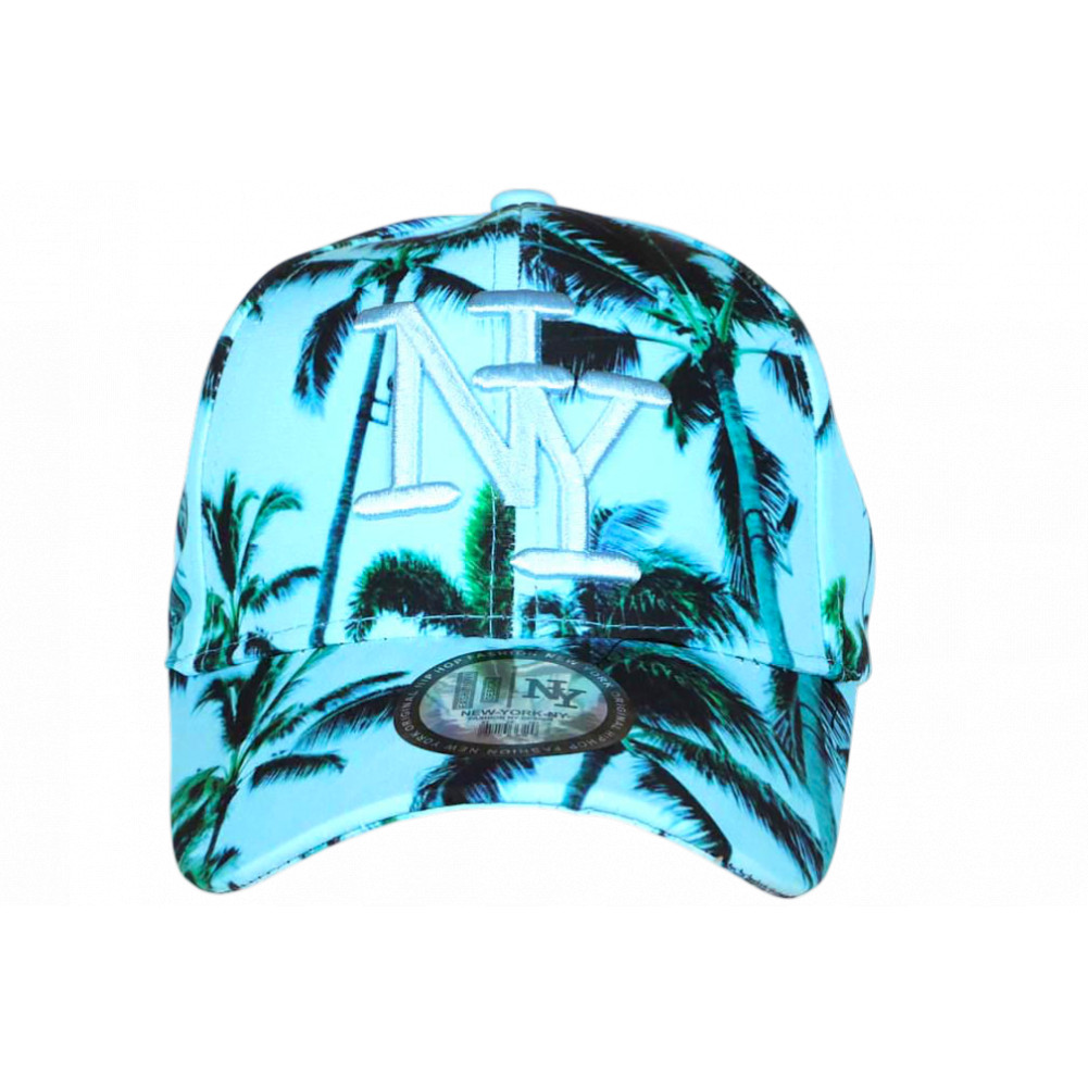 Cherchez en ligne une casquette NY Enfant turquoise Palmiers noirs et verts look plage et soleil référence Summer Sunset de la marque Hip Hop Honour, casquette palmiers garçon et fille exotique et fantaisie, visière baseball tendance, brodée NY bleu brillant en relief chic, sticker gris New York Original, taille enfant de 7 à 12 ans.