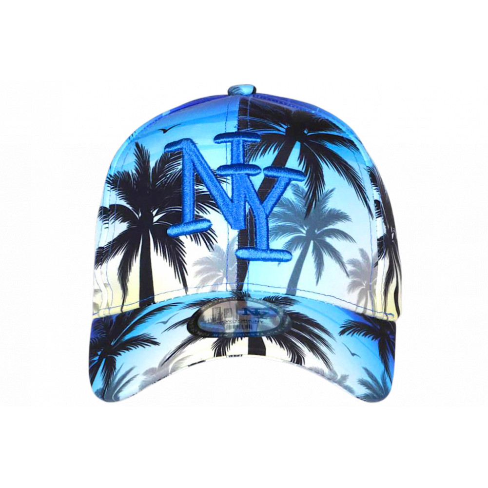 Choisir en ligne casquette NY Enfant bleue et jaune Palmiers noirs et gris mode plage et soleil modèle Sunny Sunset de marque Hip Hop Honour, casquette palmiers garçon et fille exotique et fantaisie, visière baseball tendance, brodée NY bleu brillant en relief chic, autocollant gris argent New York Original, taille enfant de 7 à 12 ans.