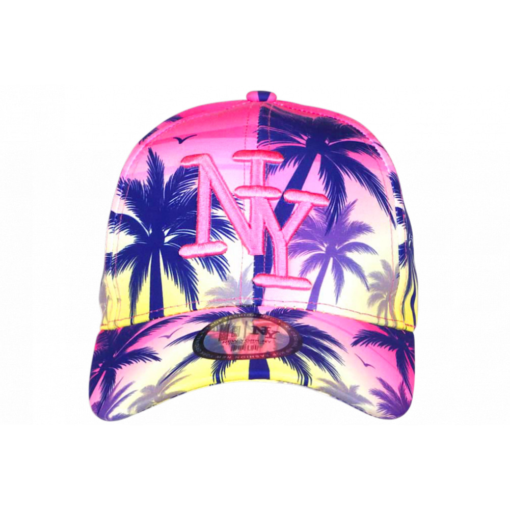Trouvez en ligne casquette NY Enfant rose et bleue Palmiers mode plage et coucher de soleil jaune modèle Lovely Sunset de la marque Hip Hop Honour, casquette palmiers fille et garçon exotique et fantaisie façon bord de mer et vacances, visière baseball tendance, brodée NY rose brillant en relief chic, autocollant gris argent New York Original, taille enfant de 7 à 12 ans.