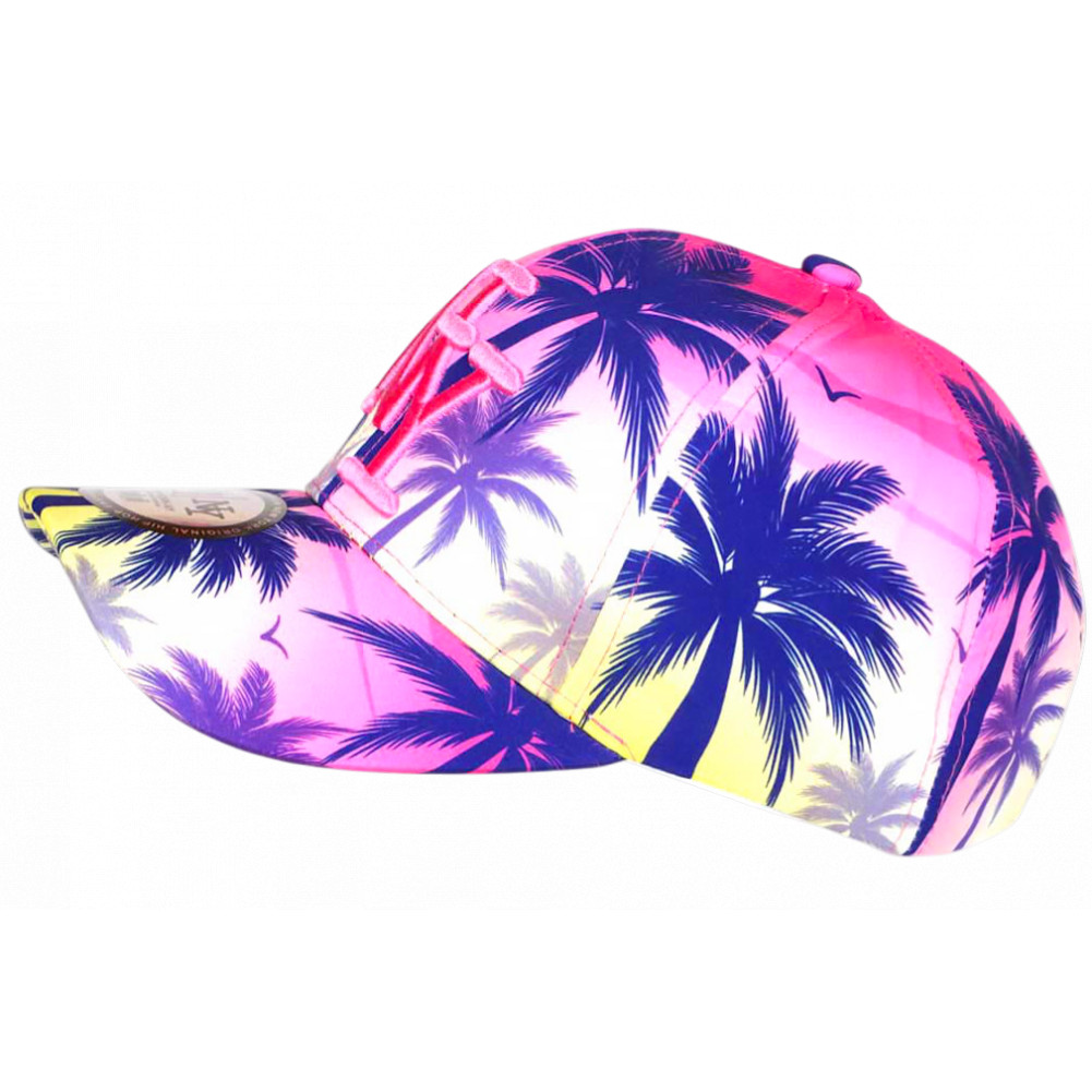 Achetez une casquette palmiers enfant pas cher tropicale collection Hip Hop of Honour référence Lovely Sunset esprit été fashion avec des motifs de palmiers bleus sur un fond rose en dégradé jaune ambiance coucher de soleil, plage et baignade pour une allure douce et vacances. Le top de cette casquette NY fille et garçon fantaisie propose la broderie du célèbre logo NY de New York City en rose brillant couture 3D pour une fabrication prestige et un jeu de couleurs douces, harmonieuses et streetwear. Le sticker argent et noir rond New York Original orne la visière baseball mode. La taille de cette casquette enfant tendance rose exotique se règle sans problème et avec précision par la languette cousue à l'arrière et sera parfaite pour les tailles de 7 à 12 ans.