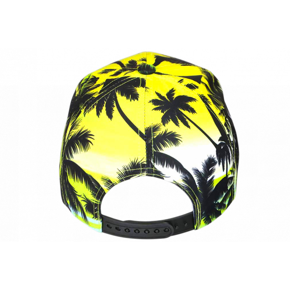Cherchez la casquette palmiers enfant pas cher tropicale collection Hip Hop of Honour Hot Purply Sunset style été fashion avec des motifs de palmiers noirs sur un fond jaune citron en dégradé vert ambiance coucher de soleil, plage et baignade pour une lifestyle douce et vacances. Le top de cette casquette NY garçon et fille originale offre la broderie du célèbre logo NY de New York City en noir brillant couture 3D pour une finition prestige et un jeu de couleurs aciudllées, harmonieuses et streetwear. Le sticker argent et noir rond New York Original décore la visière baseball mode. La taille de cette casquette enfant tendance jaune et verte exotique se règle sans problème et avec précision par la languette cousue à l'arrière et sera parfaite pour les tailles de 7 à 12 ans.