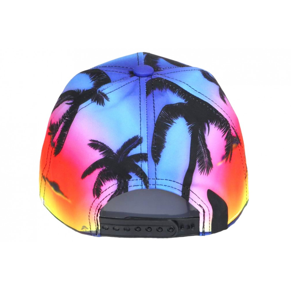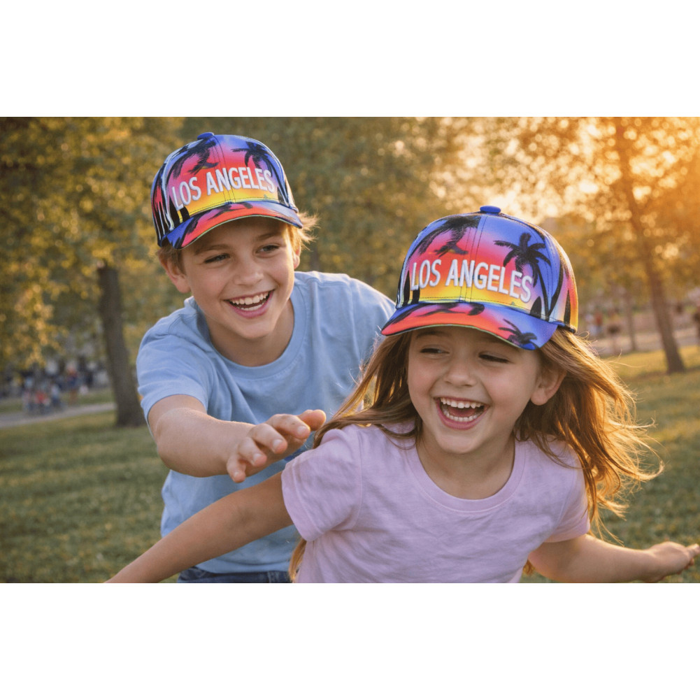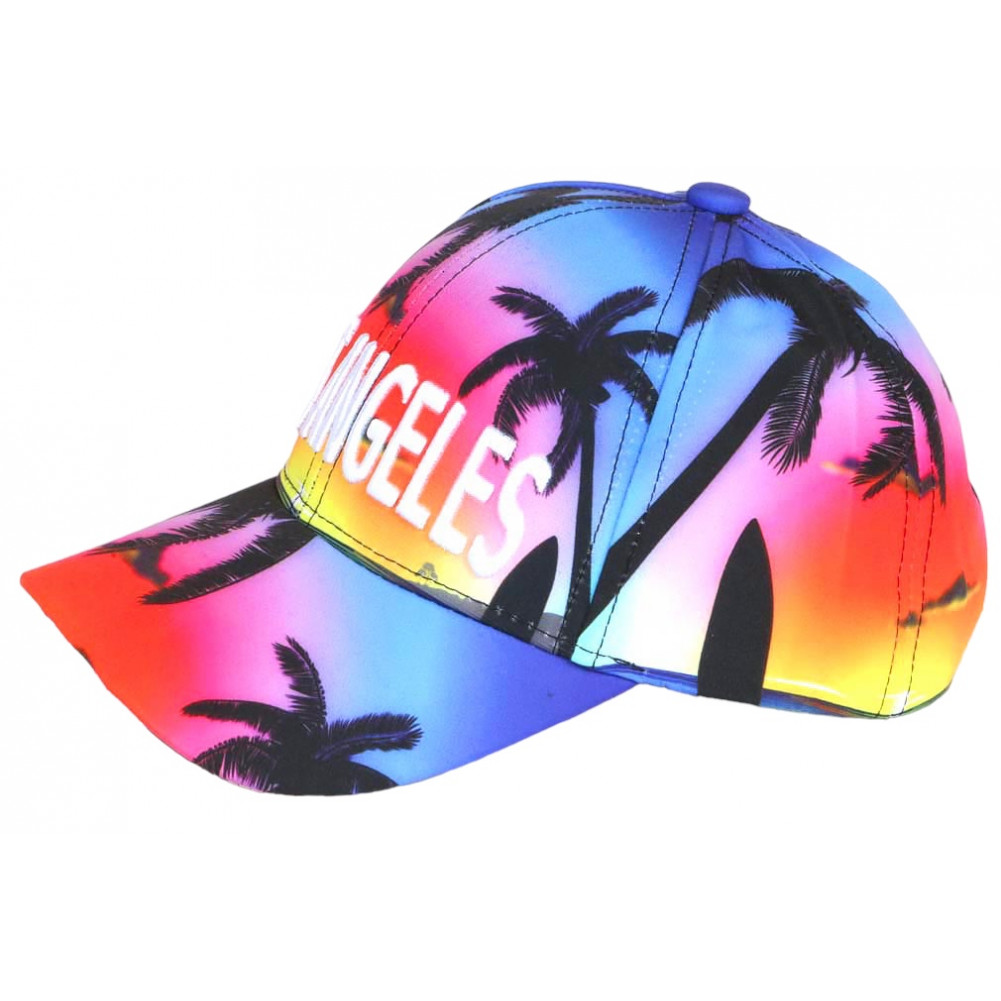 Son design multicolore dégradé, inspiré des couchers de soleil de Californie, mêle subtilement les teintes bleues et roses pour un rendu visuel moderne et dynamique. Les motifs palmiers tropicaux associés à l’inscription Los Angelesrenforcent son identité streetwear enfant, très appréciée dans la mode junior actuelle. Cette casquette devient ainsi bien plus qu’un simple accessoire : un véritable élément de style.