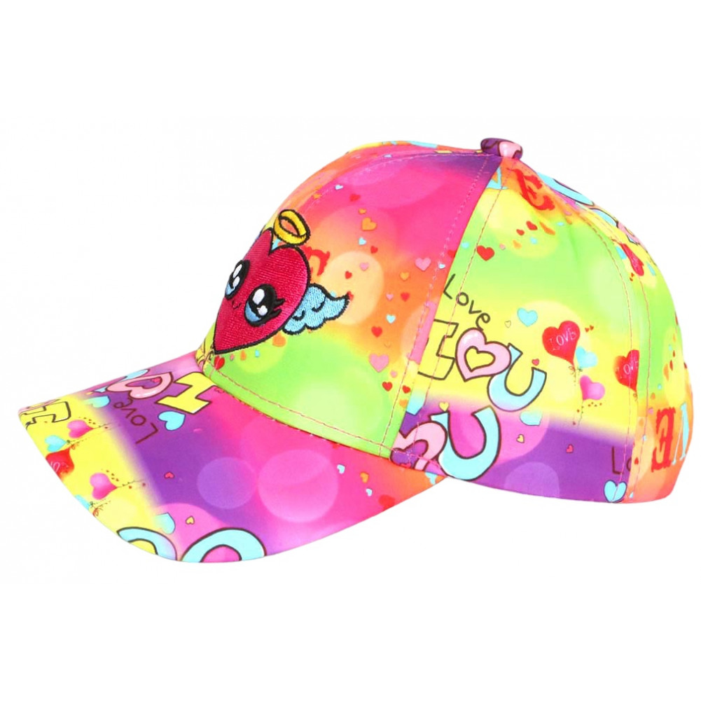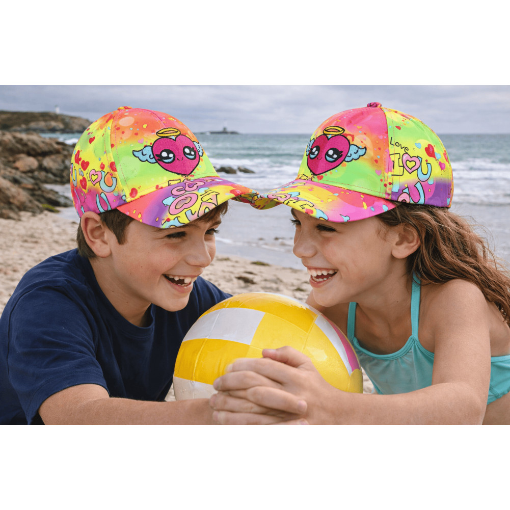 Son design met en avant un cœur rose expressif, entouré de motifs graphiques et de petits éléments inspirés de l’univers love et pop. Les couleurs vives créent une atmosphère dynamique et ludique, idéale pour une casquette enfant fille tendance qui attire le regard.