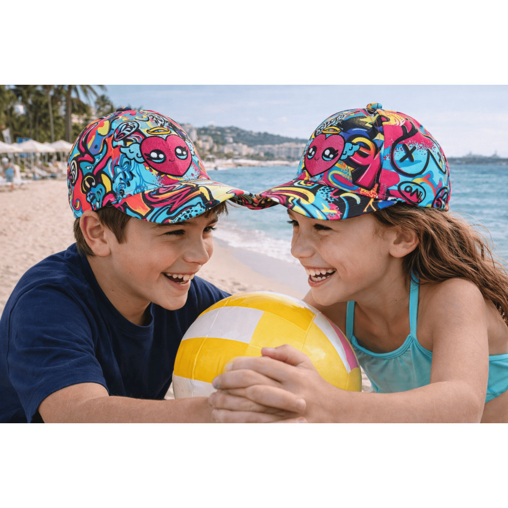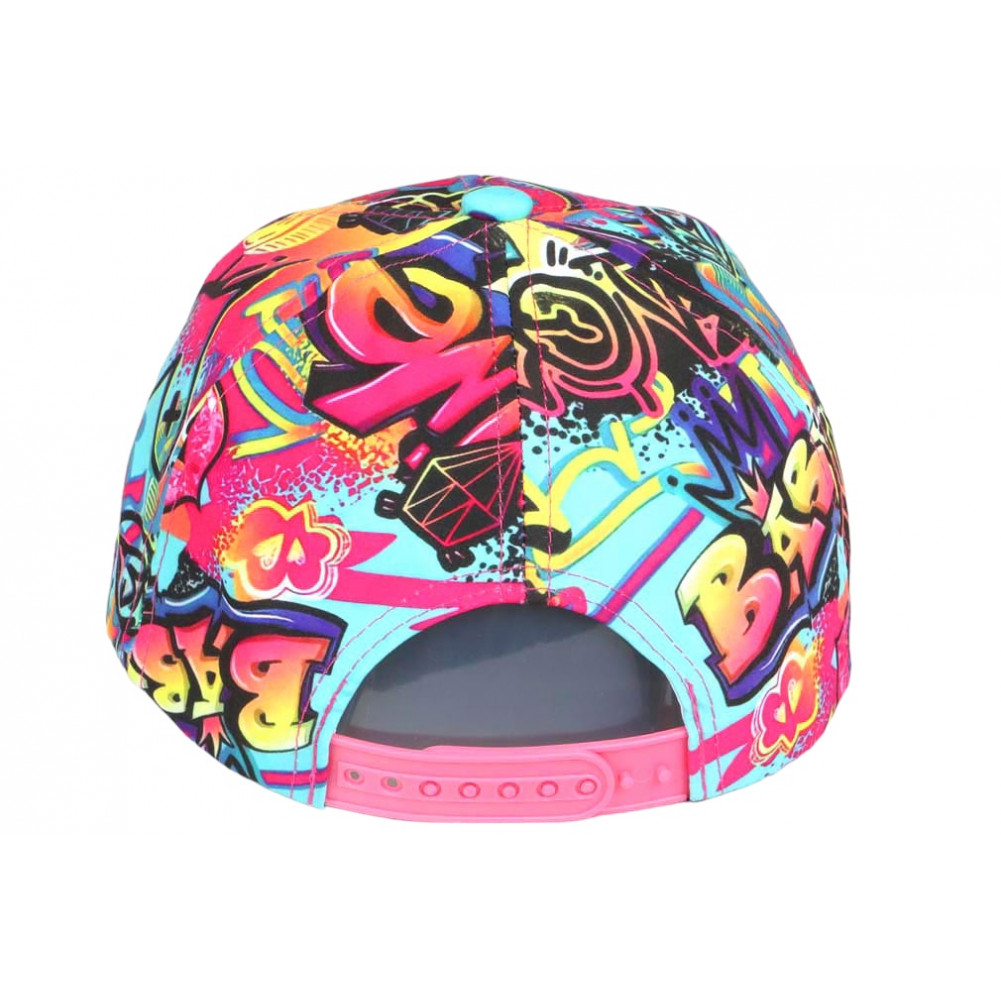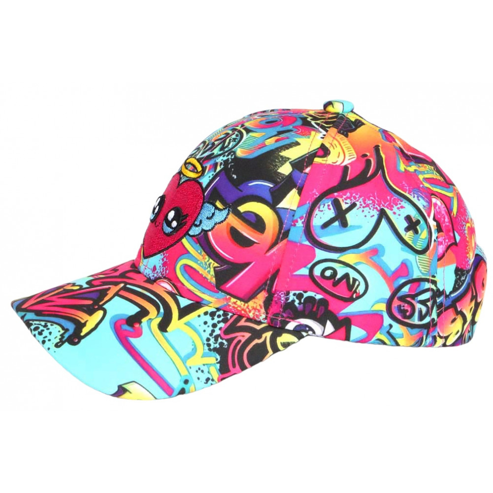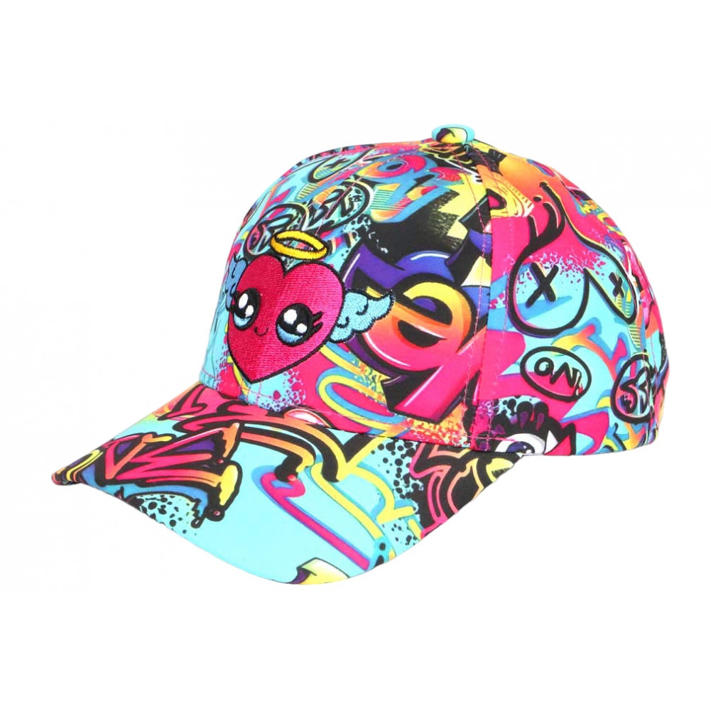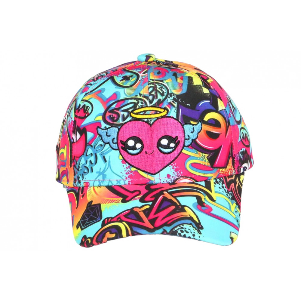 Son design se compose d’un fond turquoise éclatant, enrichi de motifs graphiques type graffiti, mêlant formes, symboles et couleurs vives. Le cœur central apporte une touche douce qui contraste avec l’énergie du décor, créant un équilibre parfait entre style urbain et expression personnelle. Cette casquette enfant streetwear s’inscrit pleinement dans les tendances actuelles.