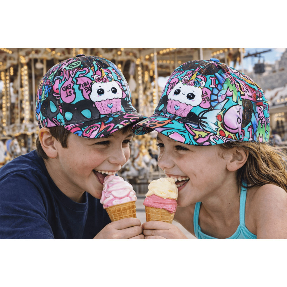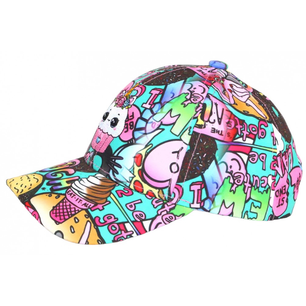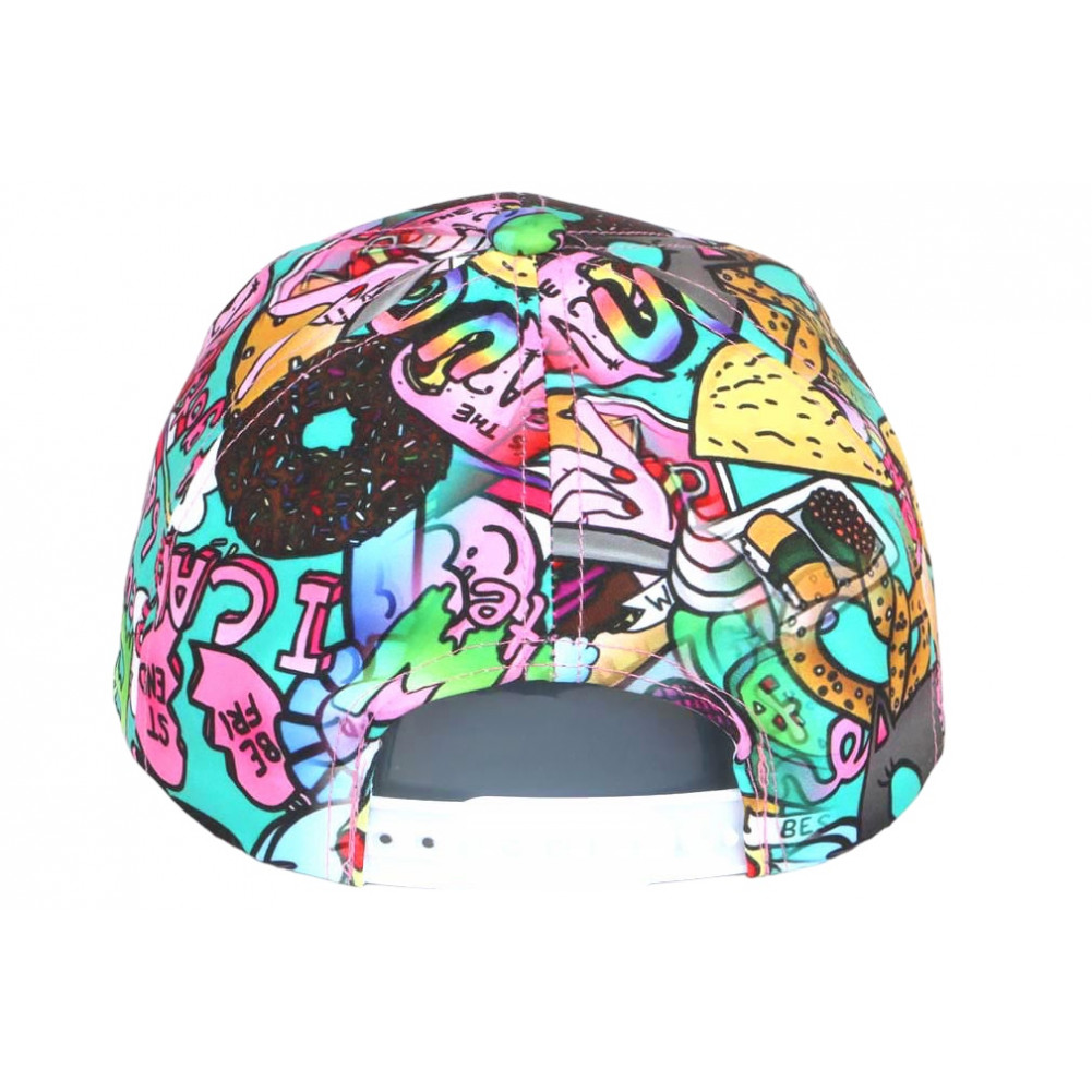 Son design se distingue par un fond turquoise vif, associé à des illustrations cartoon et des éléments ludiques inspirés d’un univers créatif. Cette combinaison donne à cette casquette enfant originale un rendu visuel dynamique qui attire immédiatement le regard.