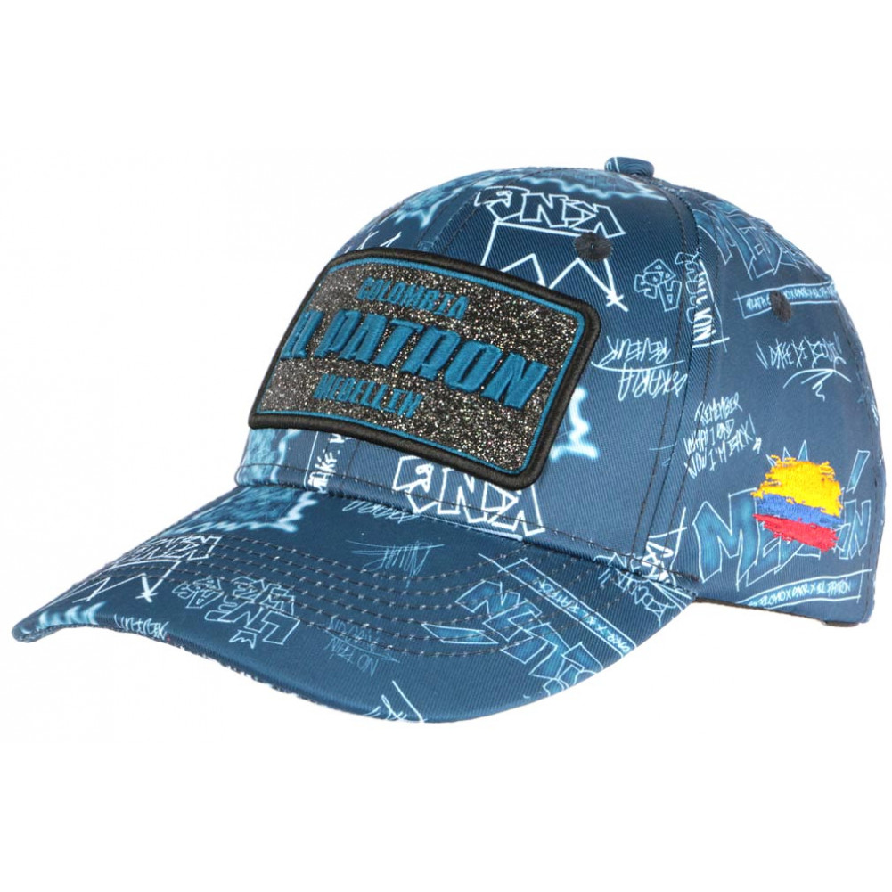 Acheter une casquette El Patron Medellin bleue collection SKR design fun fabriquée en tissu imprimé streetwear couronnes et King esprit tagué. Cette belle casquette baseball El Patron pas cher présente un grand patch El Patron Medellin Colombia bleu couture en relief, le fond est garni de paillettes brillantes noires et argentées style lumineux et prestige. Graphisme streetwear efficace et direct avec un bleu chic, cette jolie casquette Colombia bleue rappelle l'univers bad boys de Pablo Escobar avec son drapeau Colombien brodé sur le flanc gauche. Cette casquette stretwear fashion se règle simplement par une ceinture de même tissu et sa boucle en métal gris argent, une griffe SKR agrémente le côté du strap.