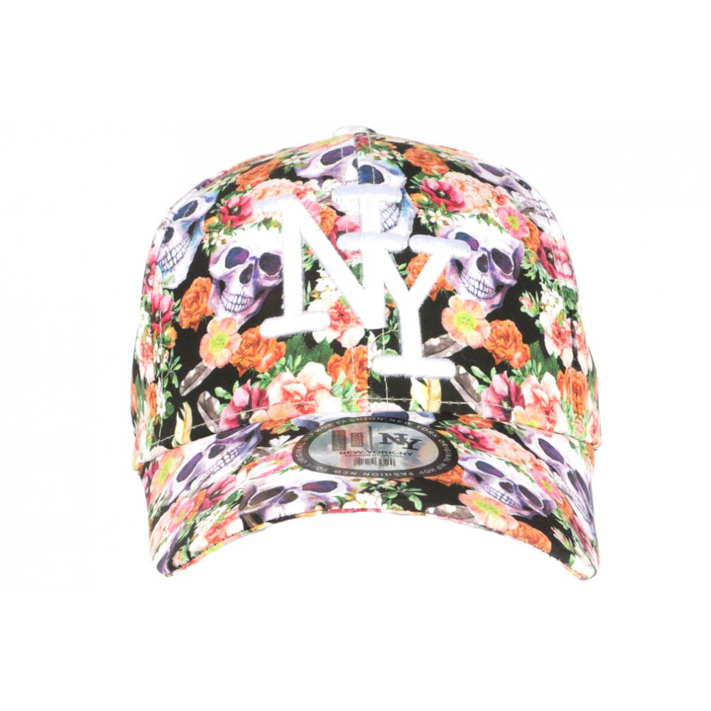 Vente casquette Baseball têtes de Mort imprimé fashion et streetwear dans des motifs de fleurs oranges et roses référence Sun Skull collection Hip Hop Honour, casquette NY homme et femme look original pour une allure city, visière baseball tendance, brodée New York blanc en relief, autocollant gris Original, taille réglable.