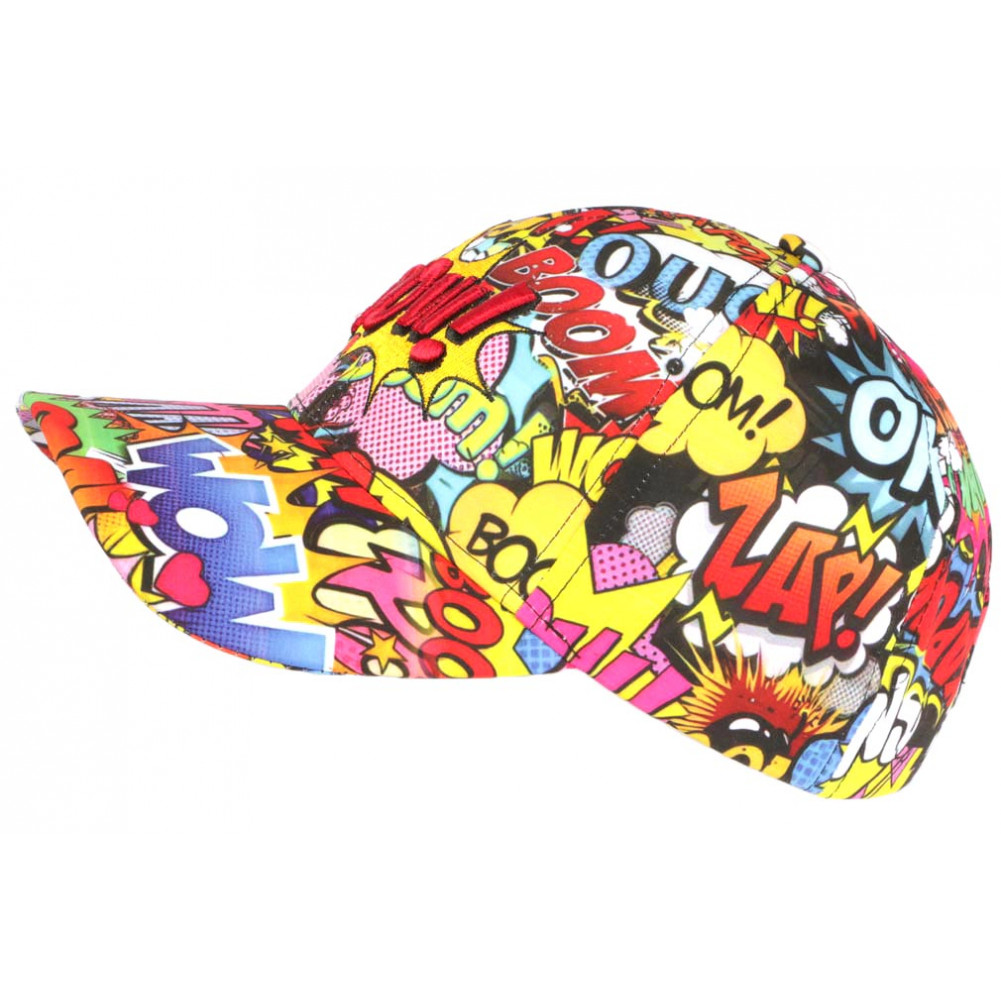 Look pop city fantaisie, achat en ligne casquette baseball homme et femme de marque Nyls Création Heartbreaker modèle Red Pow réalisée en tissu aux dessins streetwear et pop rouges, jaunes, bleus et roses avec des onomatopées façon tags! Ambiance bariolée aux coloris chauds et funs, cette jolie casquette streetwear originale pas cher affiche la broderie Pow! en rouge brillant au centre d'une explosion jaune style cartoon, la broderie est confectionnée en 3D pour une finition classe au visuel fashion, la visière est baseball look US pour une allure équilibrée. Esprit fashion pour une allure moderne créateur, la taille de cette casquette américaine city pop se règle par une ceinture en toile disposé à l'arrière.