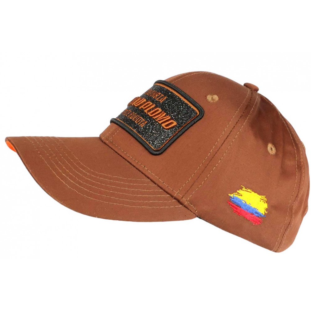 Acheter une casquette Plata o Plomo marron en tissu de coton premium de marque SKR, casquette Bogota STFE homme et femme dans un look épuré classe, écusson Plata o Plomo marron en 3D avec strass brillant, visière ronde fashion au dessous orange, taille unique réglable.