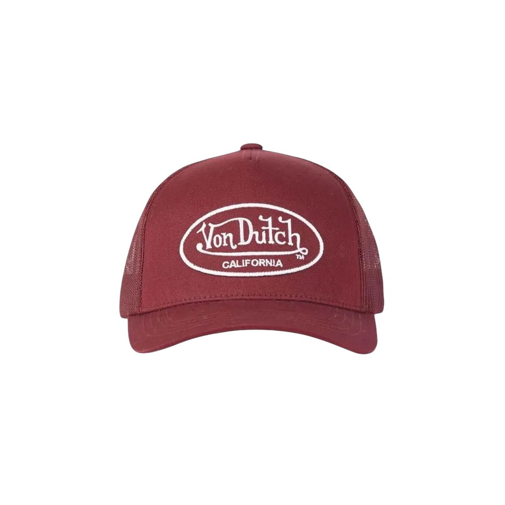 Achat casquette baseball Von Dutch rouge bordeaux homme et femme visière incurvée tendance création Von Dutch modèle Lof, casquette Von Dutch pas cher avec écusson brodée blanc sur noir style classique de la marque USA Custom, taille ajustable.