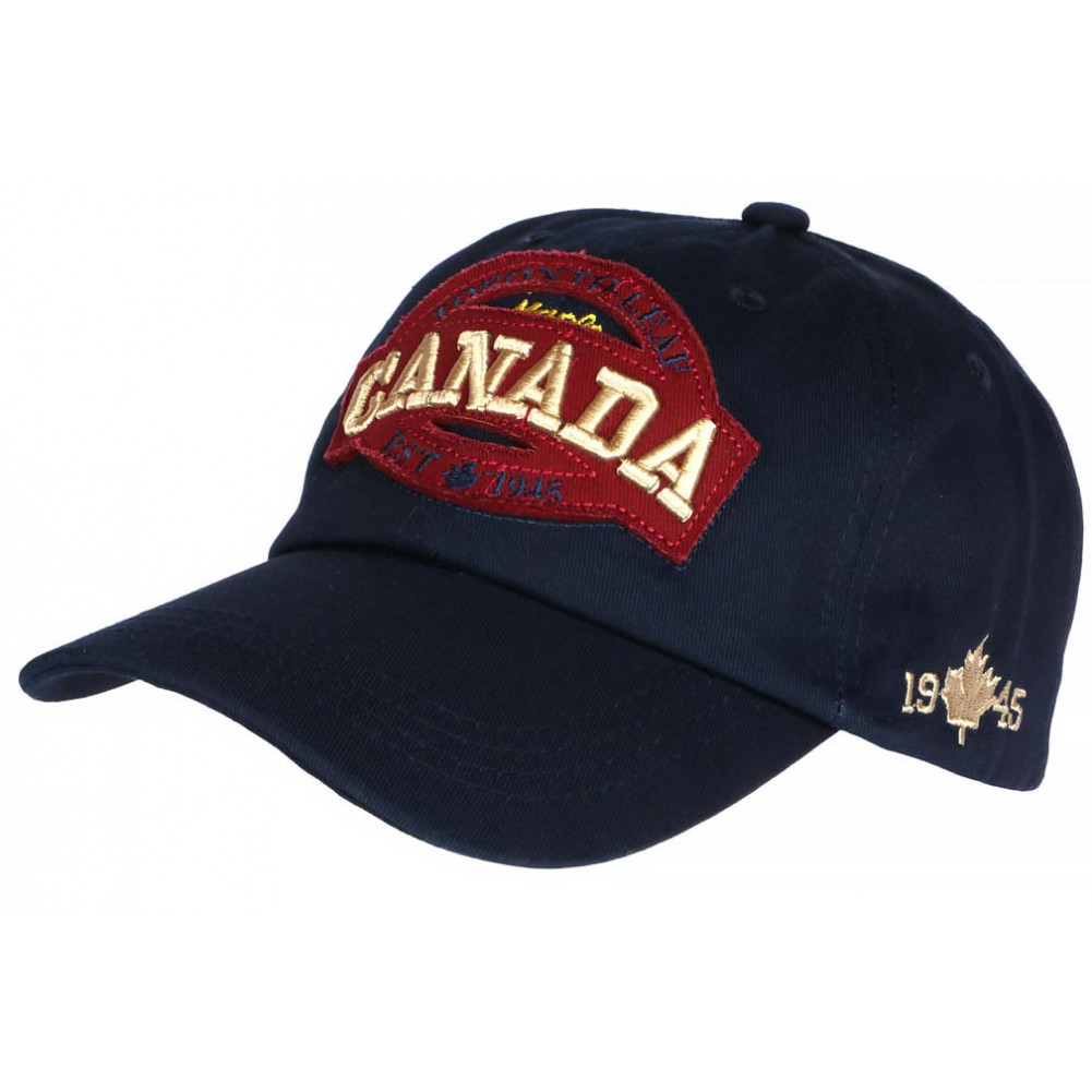 Look nord américain, acheter casquette canada marine de marque Nyls Creation avec une broderie en relief dorée pour une confection classe et qualité. D'une belle fabrication en toile souple et douce, cette belle casquette baseball homme et femme dispose d'un gros écusson avec Canada Toronto Leaf et visière courbée tendance. La célèbre feuille d'érable est brodée sur le côté gauche. Le réglage de la taille se fait classiquement par un strap en tissu et sa boucle de métal.