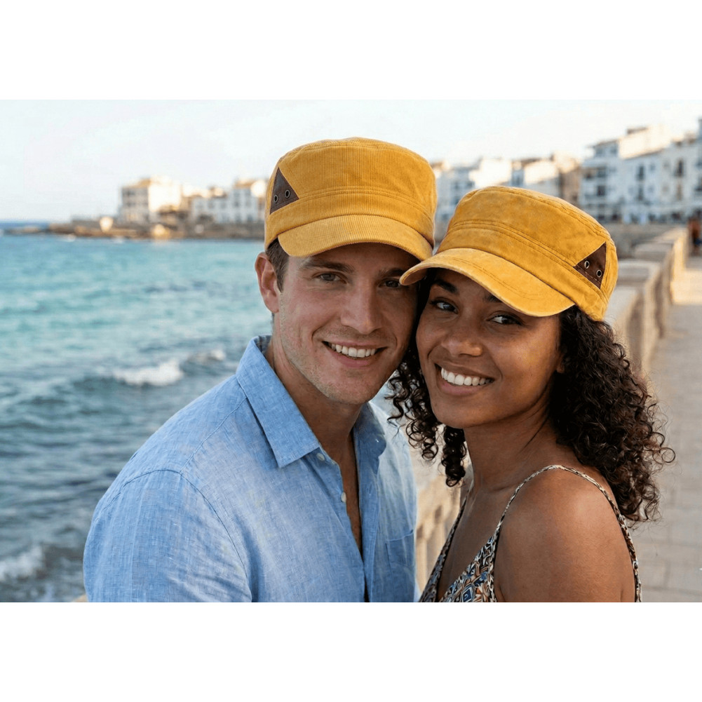 Vente casquette militaire femme et homme originale en tissu de coton avec empiècement de cuir suédine marron proposée par Nyls Création référence Lemon Stiago, casquette armée jaune classe mode cubaine fashion, visière baseball tendance, casquette army pas cher à la taille adulte réglable.