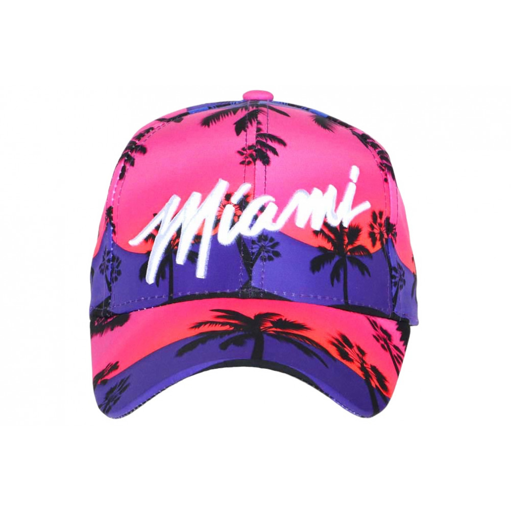 Acheter casquette Miami vioette et rose print tropical original référence Purple Sunset de la marque Hip Hop Honour Heatbreaker, casquette Miami femme et homme motifs de palmiers noirs sur une mer violette au ciel couchant rose en dégradé, visière baseball tendance, broderie Miami blanche brillante en relief, visière arrondie, taille réglable.