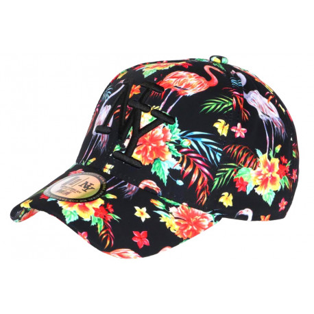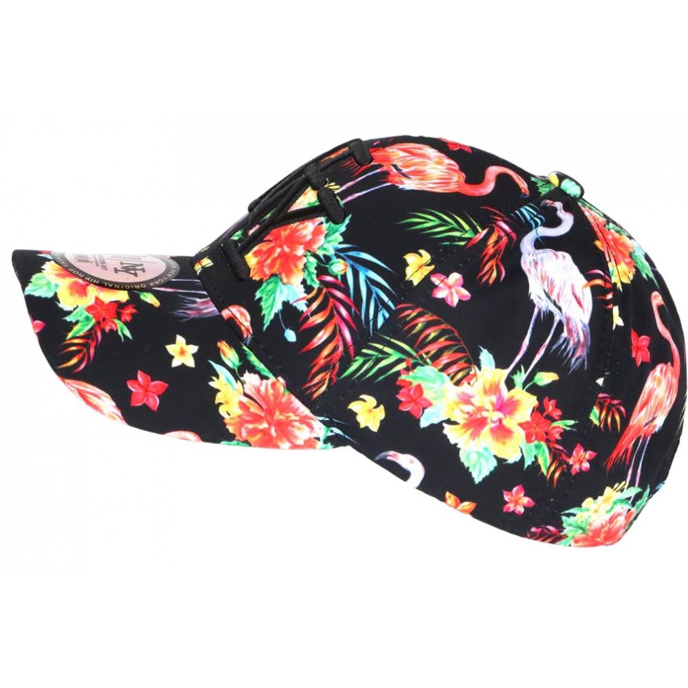 Vente en ligne casquette baseball flamants roses tropical palmiers oranges et verts sur fond noir référence Dark Flamingo création Hip Hop Honour, casquette NY femme et homme look original pour un style tendance à la plage comme en city, visière baseball classe, broderie New York noire brillante en 3D, autocollant argent New York Original, taille réglable.