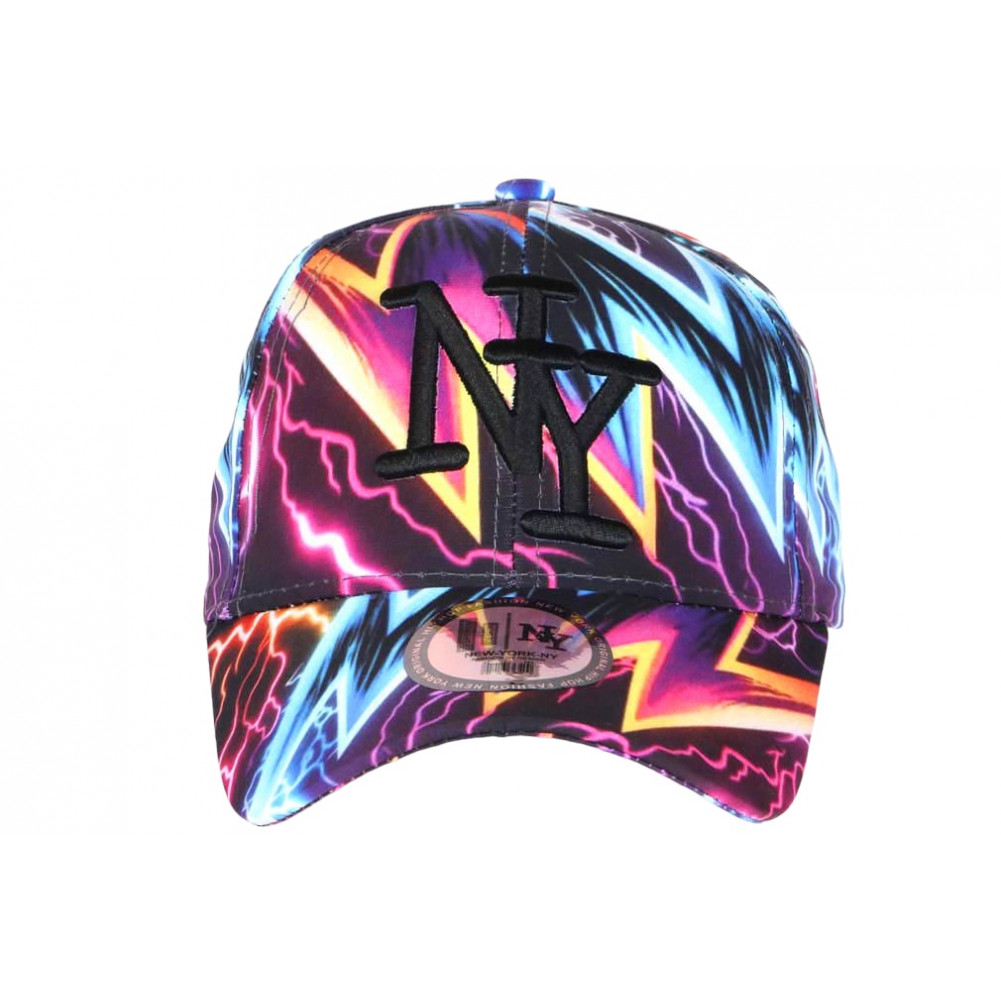 Design électrique, acheter en ligne casquette NY originale bleue proposée par Hip Hop Honour modèle Strange Stormy confectionnée en tissu souple print d'éclairs bleues et jaune orangé sur fond violée pour une allure survoltée. Cette belle casquette baseball femme et homme est montée d'une visière ronde classe présentant l'autocollant rond et argent New York Official. Le top est brodé de l'irremplaçable griffe NY de New York technique en 3D relief coloris noir brillant. Fashion et fantaisie, la taille de cette casquette New York bleue streetwear fashion se règle avec précision par une attache plastique souple fixée sur l'arrière.