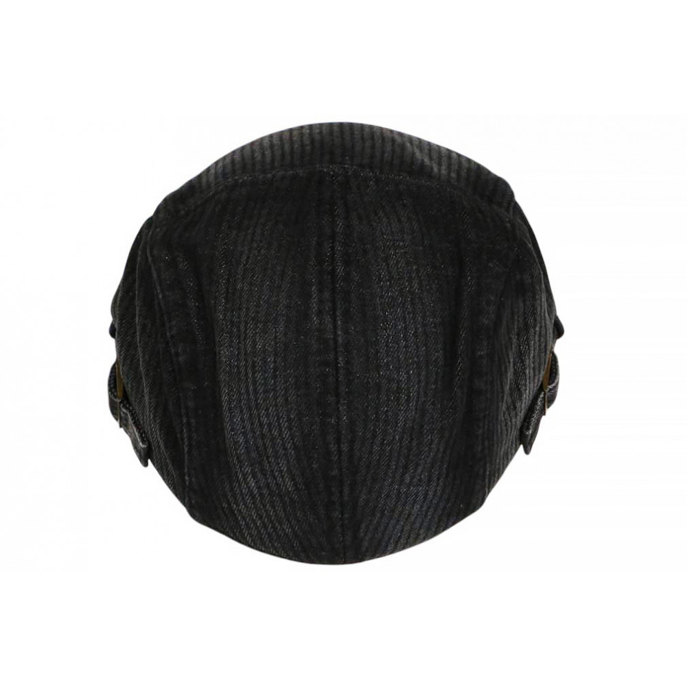 Vente casquette noire en jeans homme et femme tendance et originale en coton premium avec rayures qualité souple et robuste, casquette béret noir denim pas cher vintage effet délavé, forme plate avec empiècements fantaisies, taille réglable sur les côtés, modèle Dark Sylyk de marque par Nyls Création.