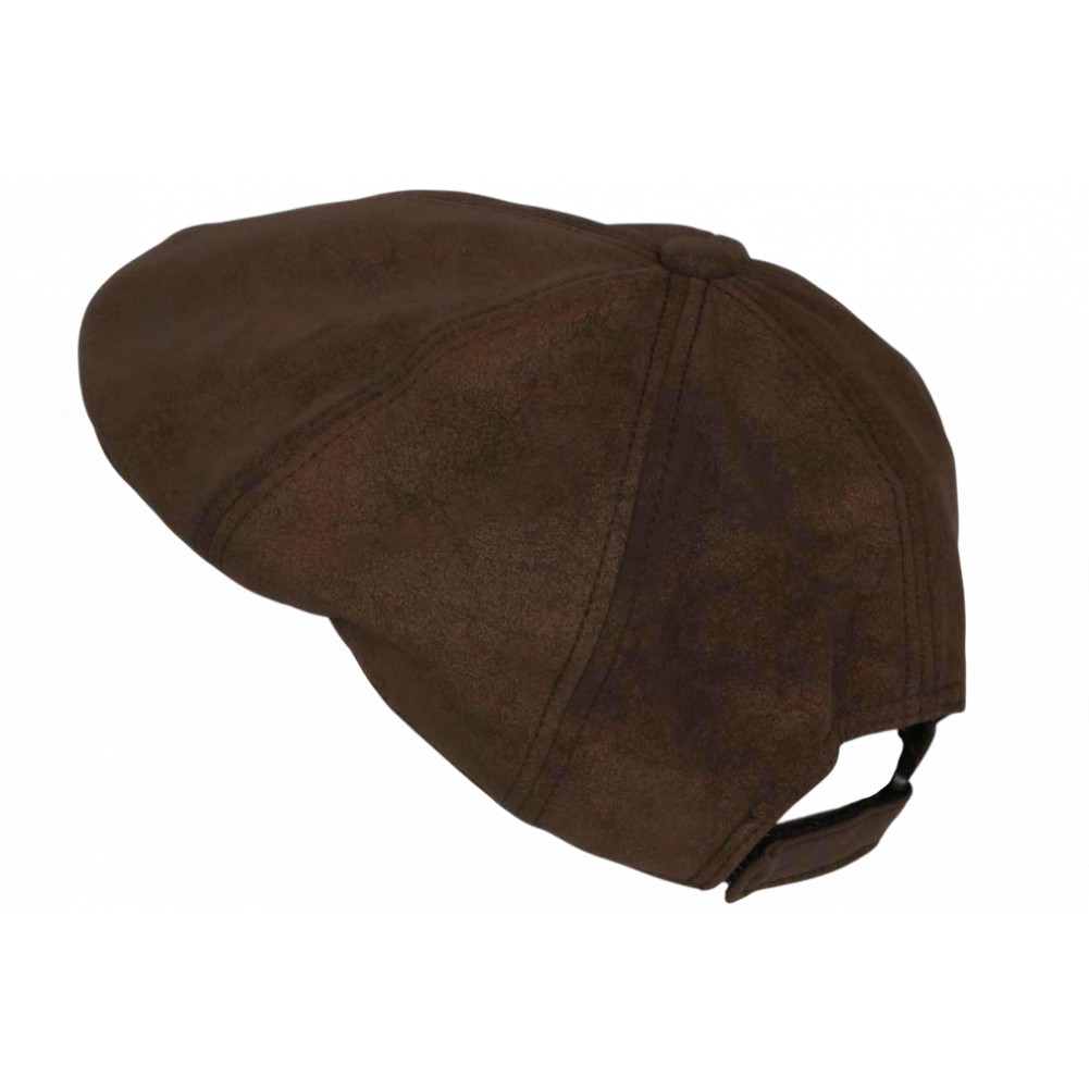 Choisissez en ligne un béret casquette vintage en cuir marron chocolat synthétique confectionnée en suédine homme et femme modèle Brown Nylro de marque Nyls Création, casquette béret gavroche rétro imitation cuir de daim retro et confort, visière courbée marron foncé, taille ajustable avec ceinture arrière.