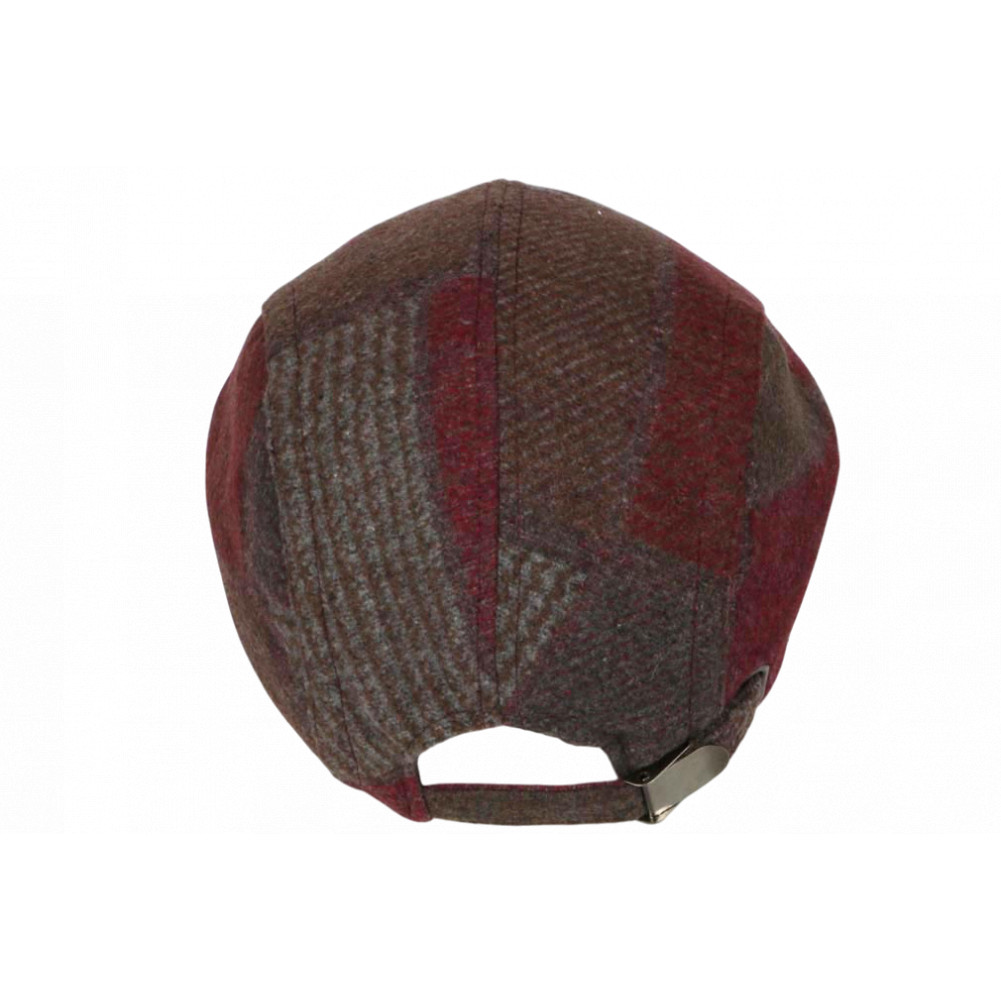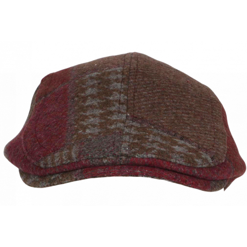 Vente en ligne un béret casquette anglaise rouge bordeaux et marron graphisme patchwork tradition chapelière marque Nyls Création modèle Red Windsaur, casquette plate homme et femme en laine carreaux rouges marrons doublure matelassée en toile noire pour un look britannique ou hipster. Casquette hiver pas cher Motifs pied-de-poule, chevron, taille ajustable. Parfaite pour un style rétro ou casual.
