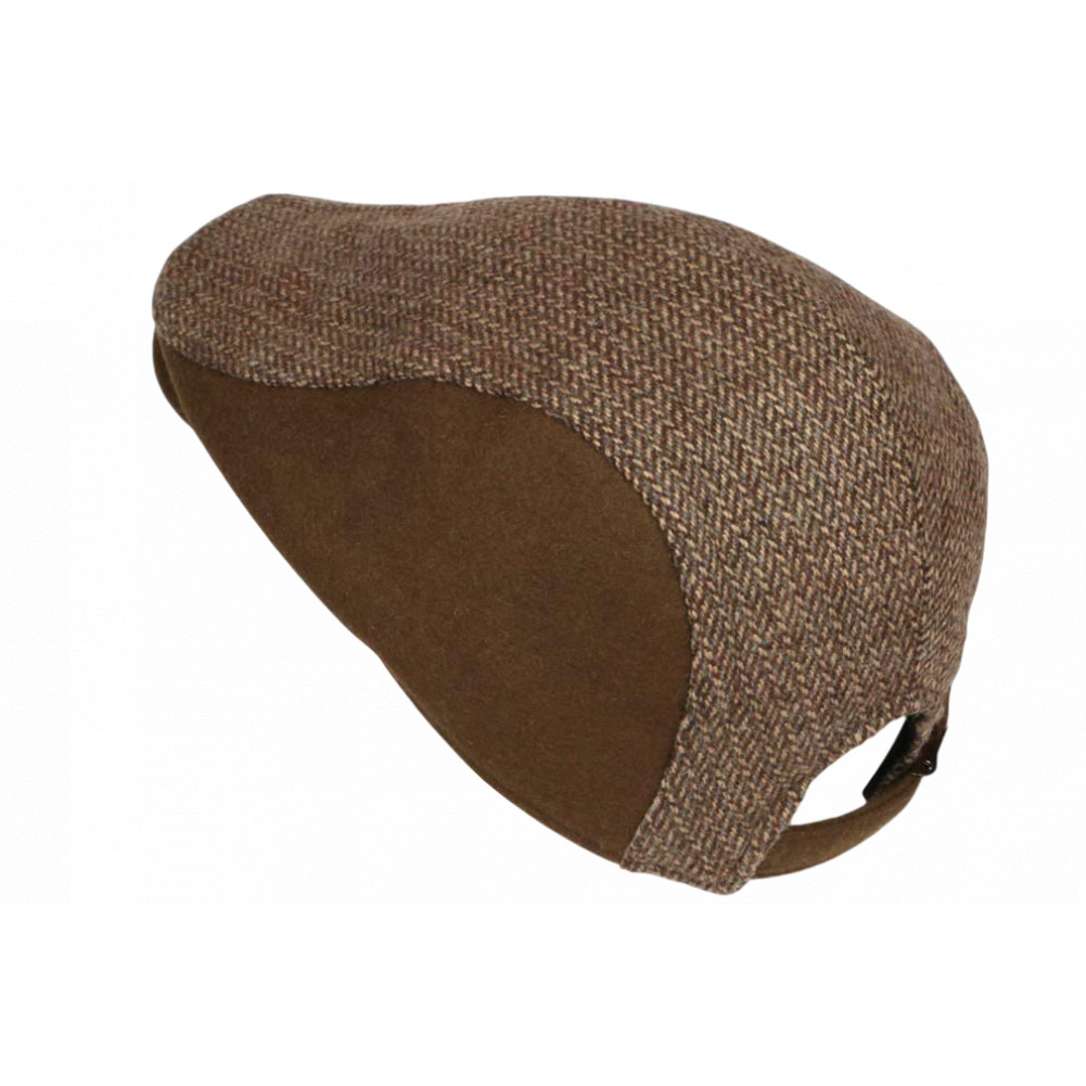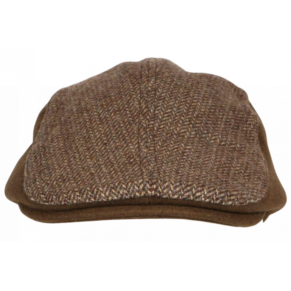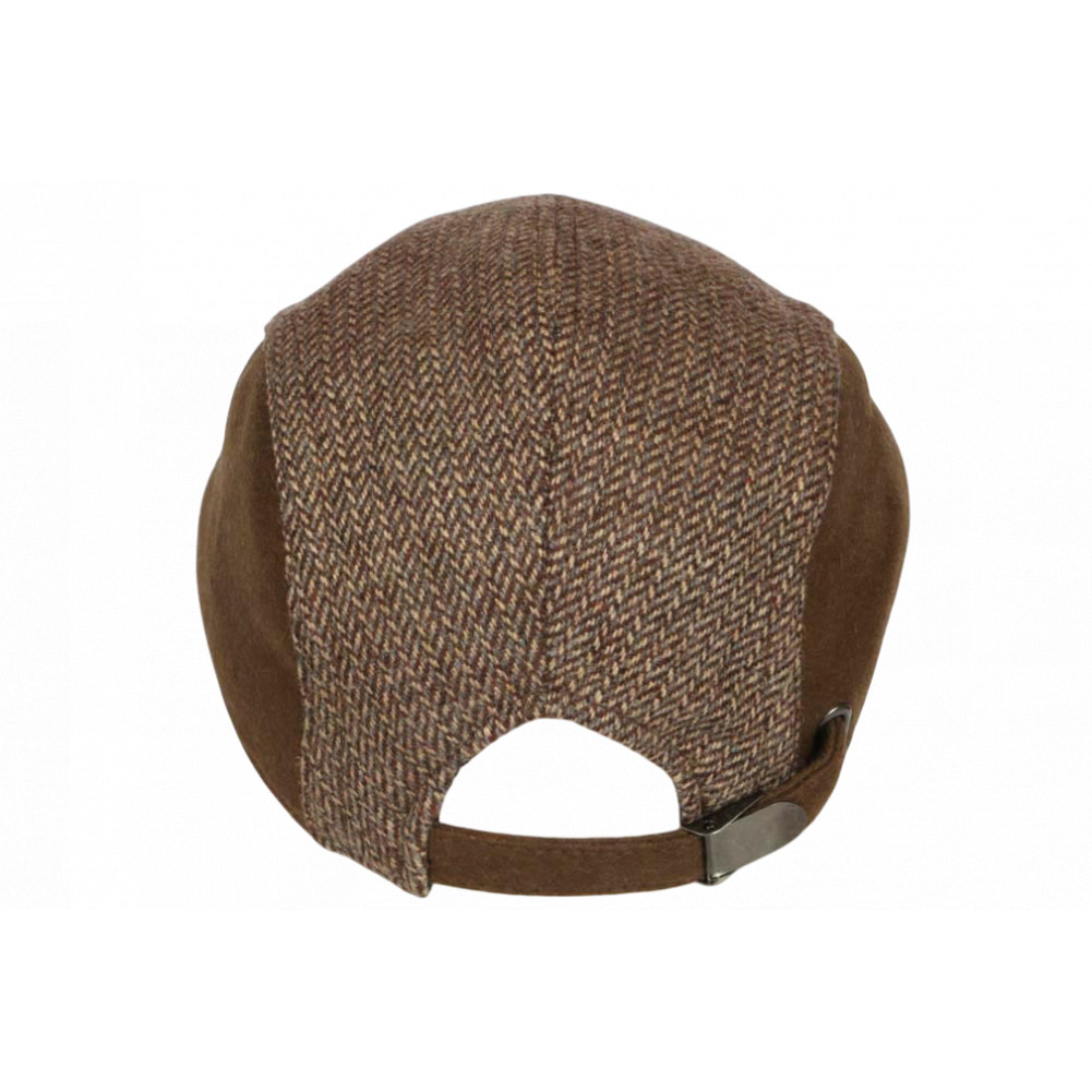 Choisissez en ligne une casquette anglaise marron en laine design chevrons pas cher look rétro tendance qualité chapelière tradition de marque Nyls Création modèle Brown Motytz, béret casquette hiver homme et femme en laine mixée, doublure molletonnée pour un style vintage classe et confort. Casquette plate marron Taille réglable avec ceinture et boucle de métal arrière.