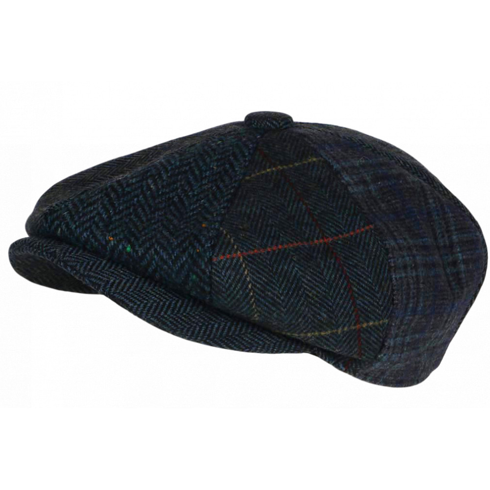 Chaque béret casquette patchwork bleue en laine est une création unique, composée de multiples tissus traditionnels : chevrons, carreaux, pied-de-poule et tweeds colorés.