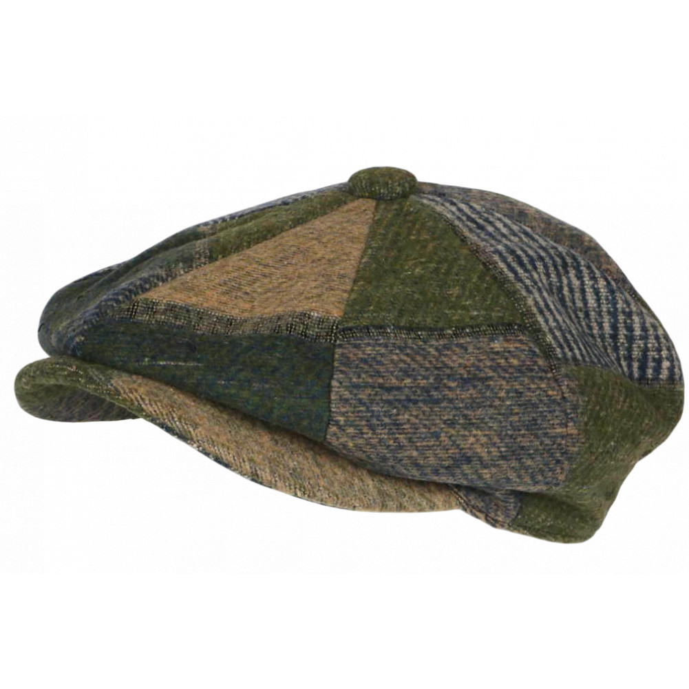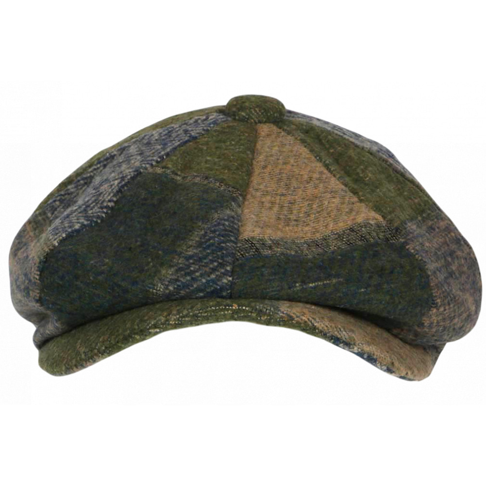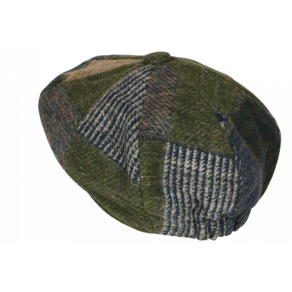 Chaque béret casquette patchwork verte en laine est une création unique, composée de multiples tissus traditionnels : chevrons, carreaux, pied-de-poule et tweeds colorés.