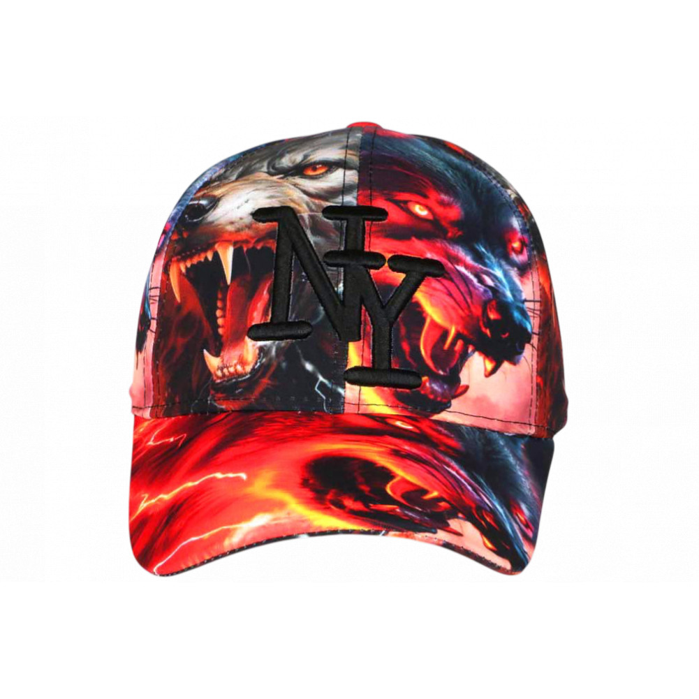 Découvrez en ligne la casquette loup rouge et bleue imprimé original avec des gueules de loup au regard menaçant modèle Blood Wolf de marque Hip Hop Honour, casquette NY homme et femme design original pour une silhouette fashion, visière baseball mode, broderie New York noir brillant en 3D, autocollant argent Original, taille ajustable.