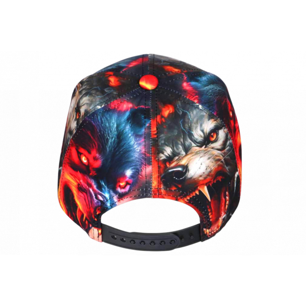 Imprimé Loup Haute Définition : La couronne de la casquette arbore un portrait de loup détaillé, aux traits agressifs et aux couleurs vibrantes, créant un contraste saisissant avec le logo.