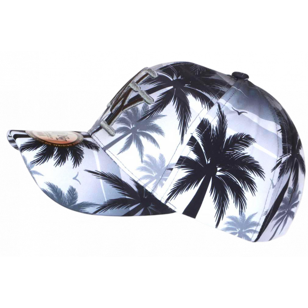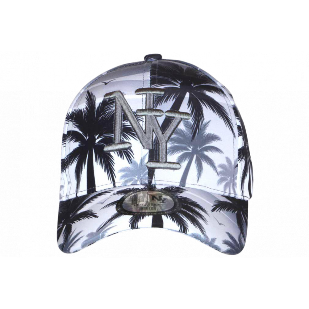 Acdhatez en ligne une casquette palmiers noir et blanc, style exotique streetwear, logo NY brodé gris en relief, taille ajustable. Casquette NY tropicale homme et femme mode été, vacances et look urbain tendance.