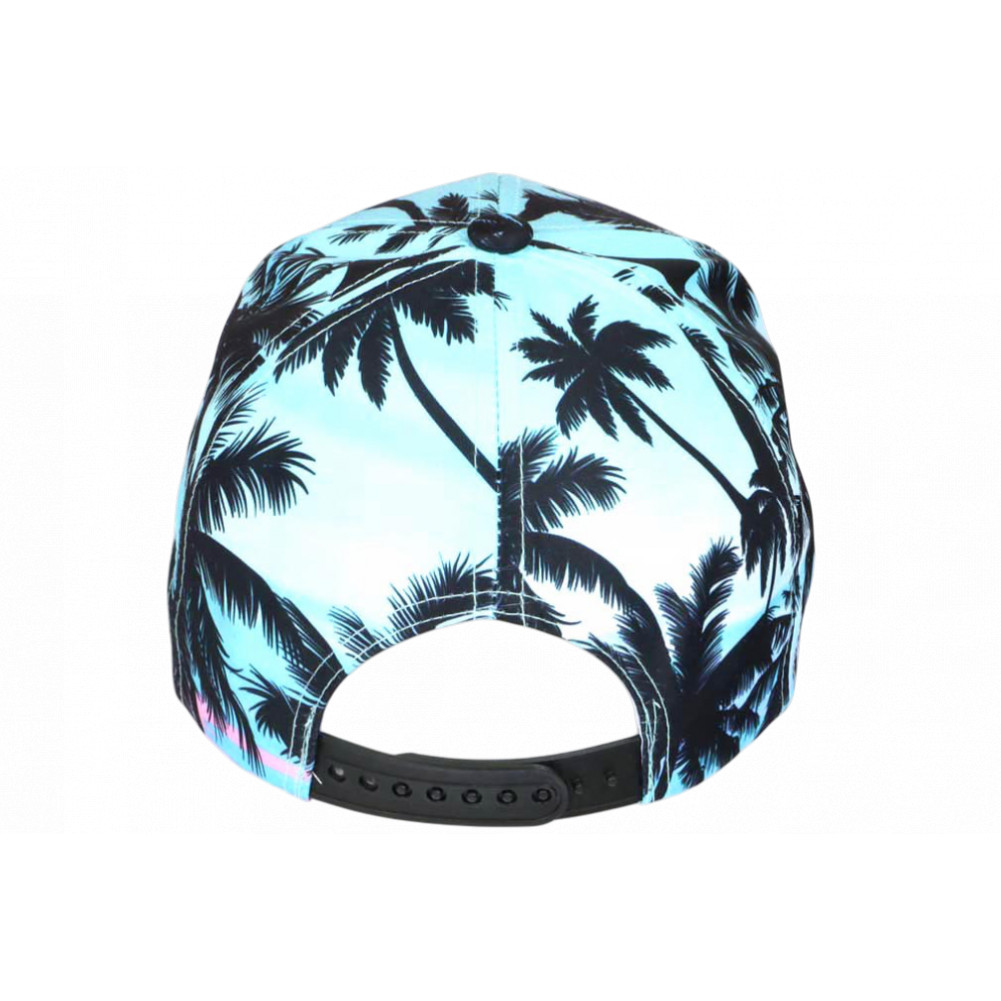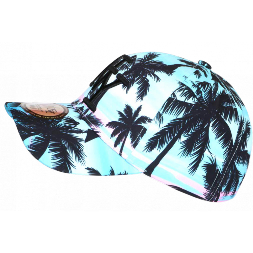 Vente en ligne casquette palmiers turquoise et rose graphisme tropical bord de mer Caraïbes référence Aqua Sunset de la marque Hip Hop Honour, casquette NY tropicale femme et homme originale look exotique plage et farniente ambiance cool, brodée NY noir brillant en 3D, visière ronde tendance, sticker New York Original argent, taille réglable.