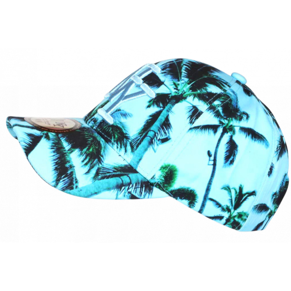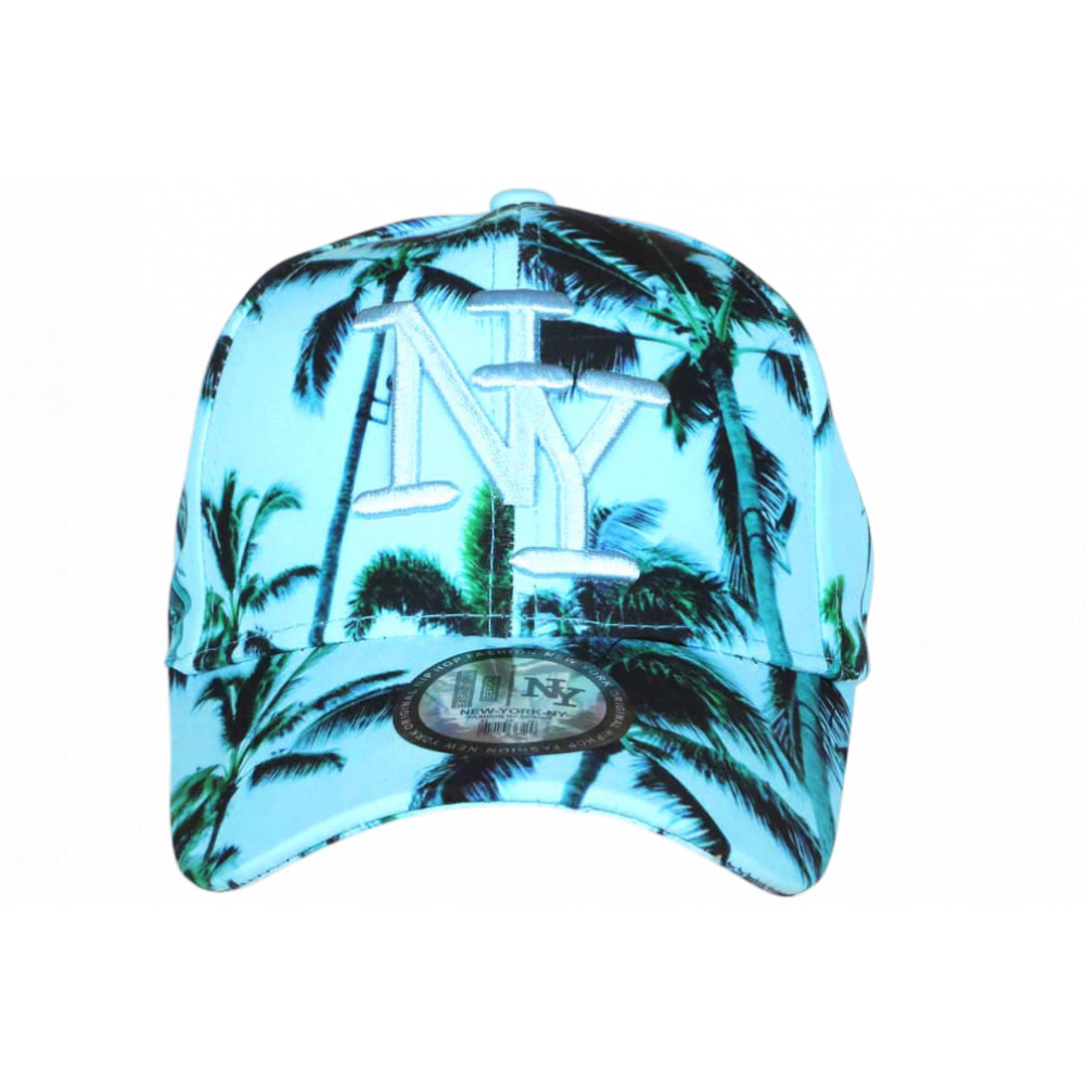 Choisissez en ligne la casquette palmiers turquoise look tropical bord de mer Caraïbes référence Summer Sunset marque Hip Hop Honour, casquette NY tropicale femme et homme originale design exotique plage et farniente mode cool, brodée NY bleu brillant en 3D, visière baseball tendance, sticker New York Original argent, taille réglable.