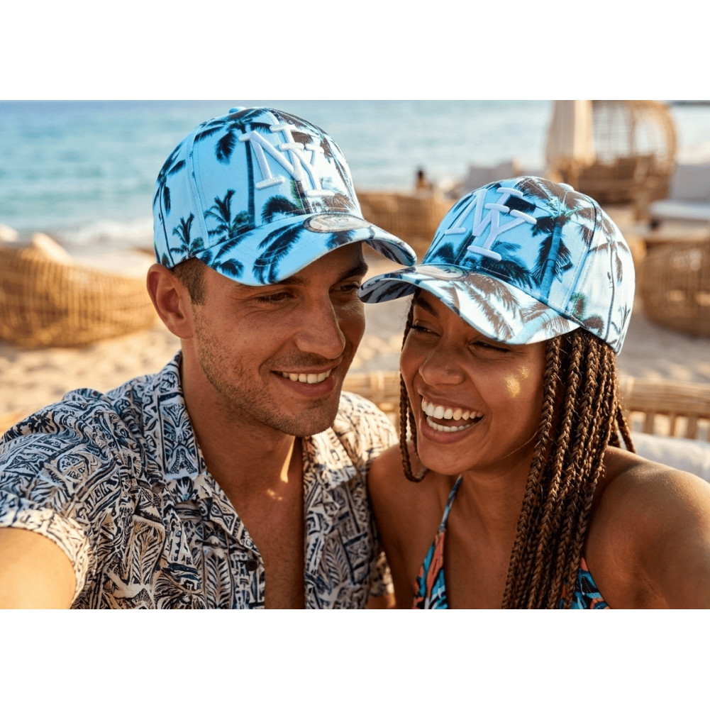 Adoptez un look frais et estival avec cette casquette NY palmier turquoise, un modèle incontournable pour un esprit streetwear tropical moderne. Son fond dégradé aux nuances bleu turquoise et vert apporte une touche lumineuse et tendance, parfaitement équilibrée par les palmiers noirs contrastés.