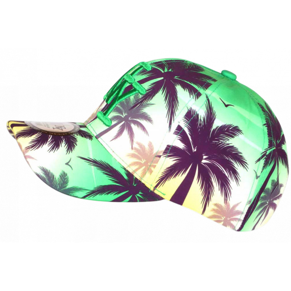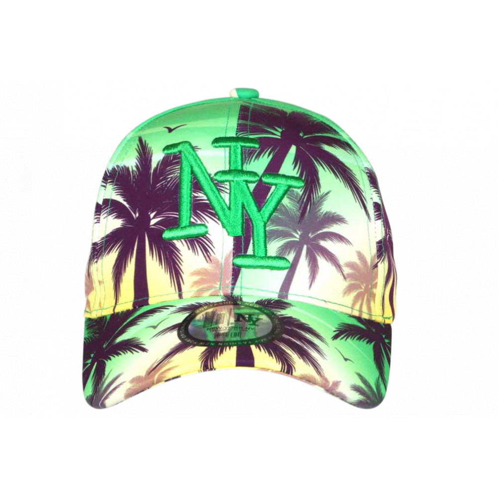 Acheter en ligne une casquette palmiers vert et jaune look tropical bord de mer Caraïbes modèle Greeny Sunset de marque Hip Hop Honour, casquette NY tropicale homme et femme originale et exotique ambiance plage et farniente mode cool, brodée NY vert brillant en 3D, visière baseball tendance, sticker New York Original argent, taille réglable.