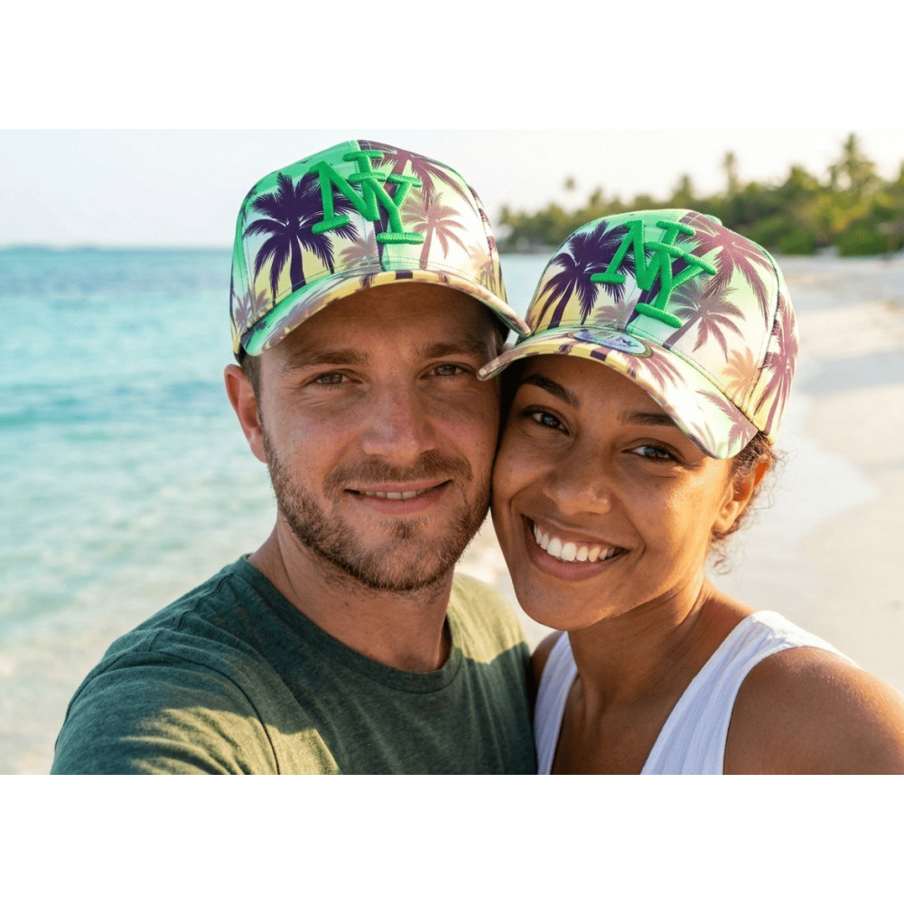 Optez pour un look frais et estival avec cette casquette NY palmier verte et jaune, un modèle incontournable pour un esprit streetwear tropical moderne. Son fond dégradé aux nuances vertes et soleil apporte une touche lumineuse et tendance, parfaitement équilibrée par les palmiers noirs contrastés.