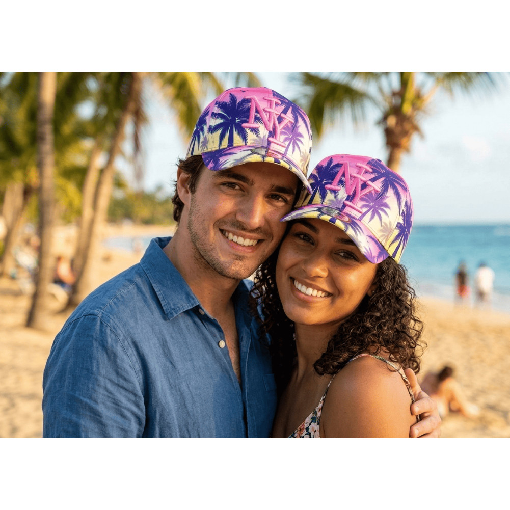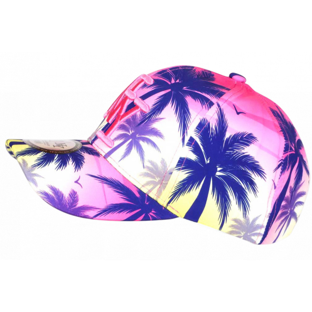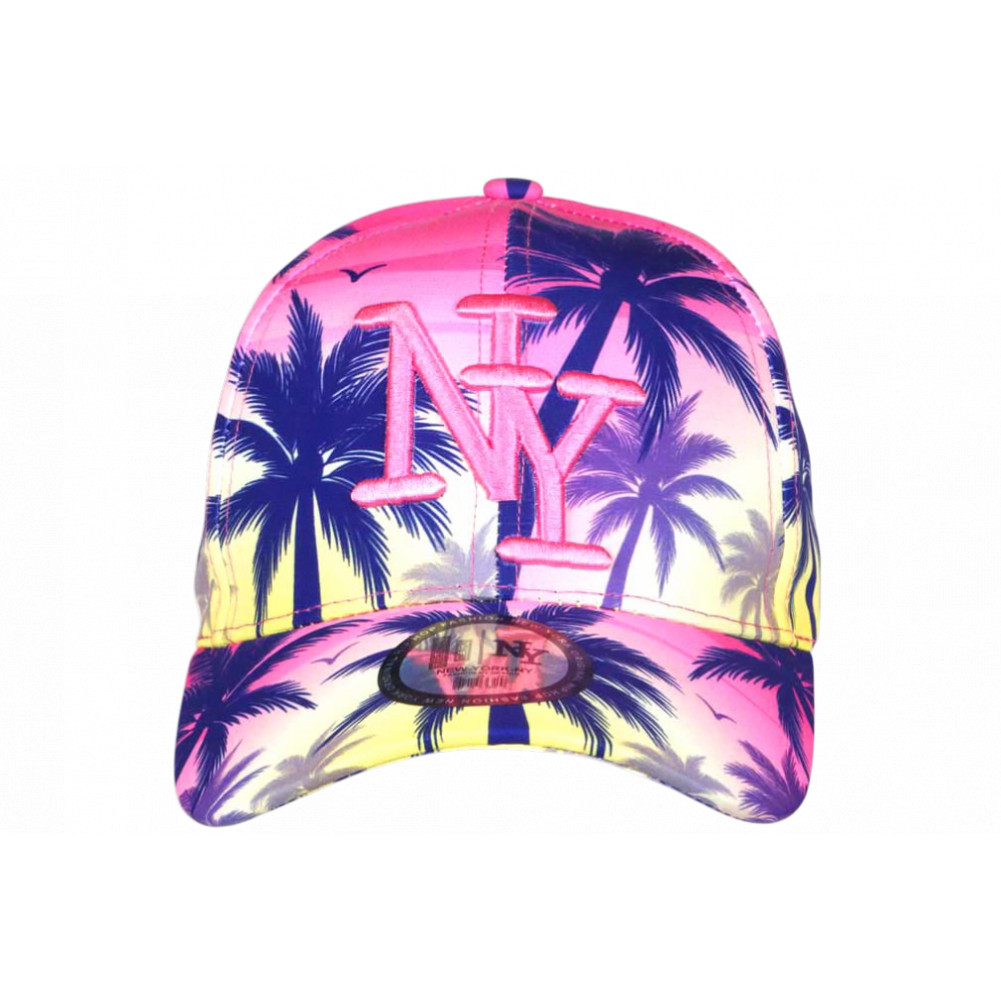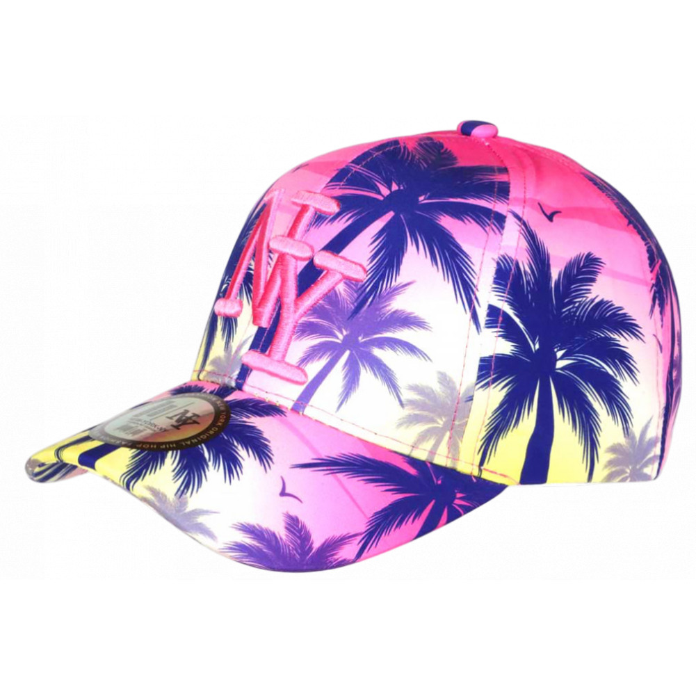 Choisissez en ligne une casquette palmiers rose et bleue print tropical bord de mer Caraïbes modèle Lovely Sunset marque Hip Hop Honour, casquette NY tropicale femme et homme originale et exotique esprit plage, baignade et farniente cool, brodée NY rose brillant en 3D, visière baseball tendance, autocollant New York Original gris argent, taille réglable.