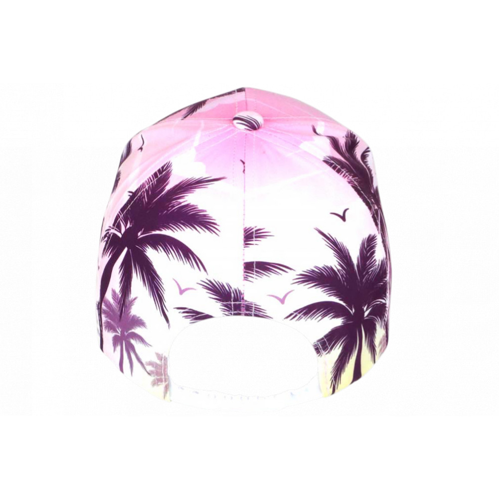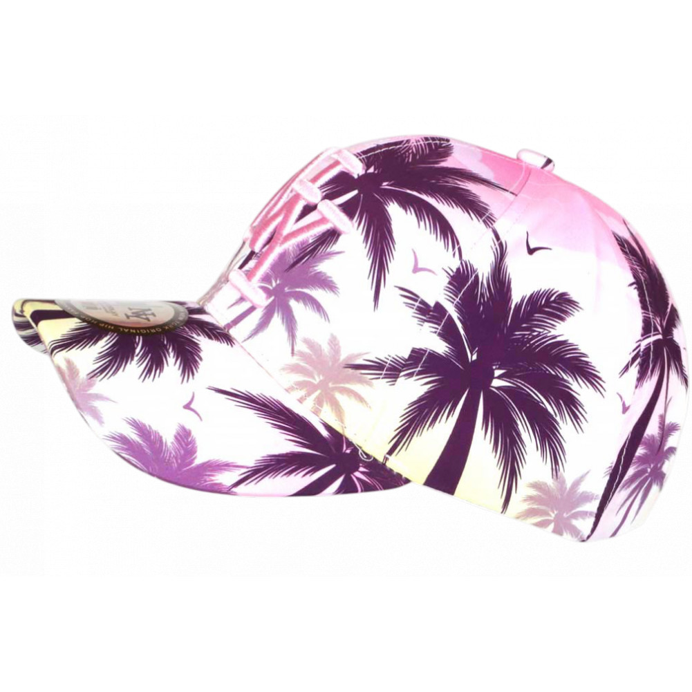Vente casquette palmiers rose pastel imprimé violet tropical bord de mer Caraïbes modèle Soft Sunset de marque Hip Hop Honour, casquette NY tropicale femme et homme originale et exotique ambiance plage, baignade et farniente cool, brodée NY rose pastel clair en 3D, visière baseball tendance, autocollant New York Original gris argent, taille réglable.