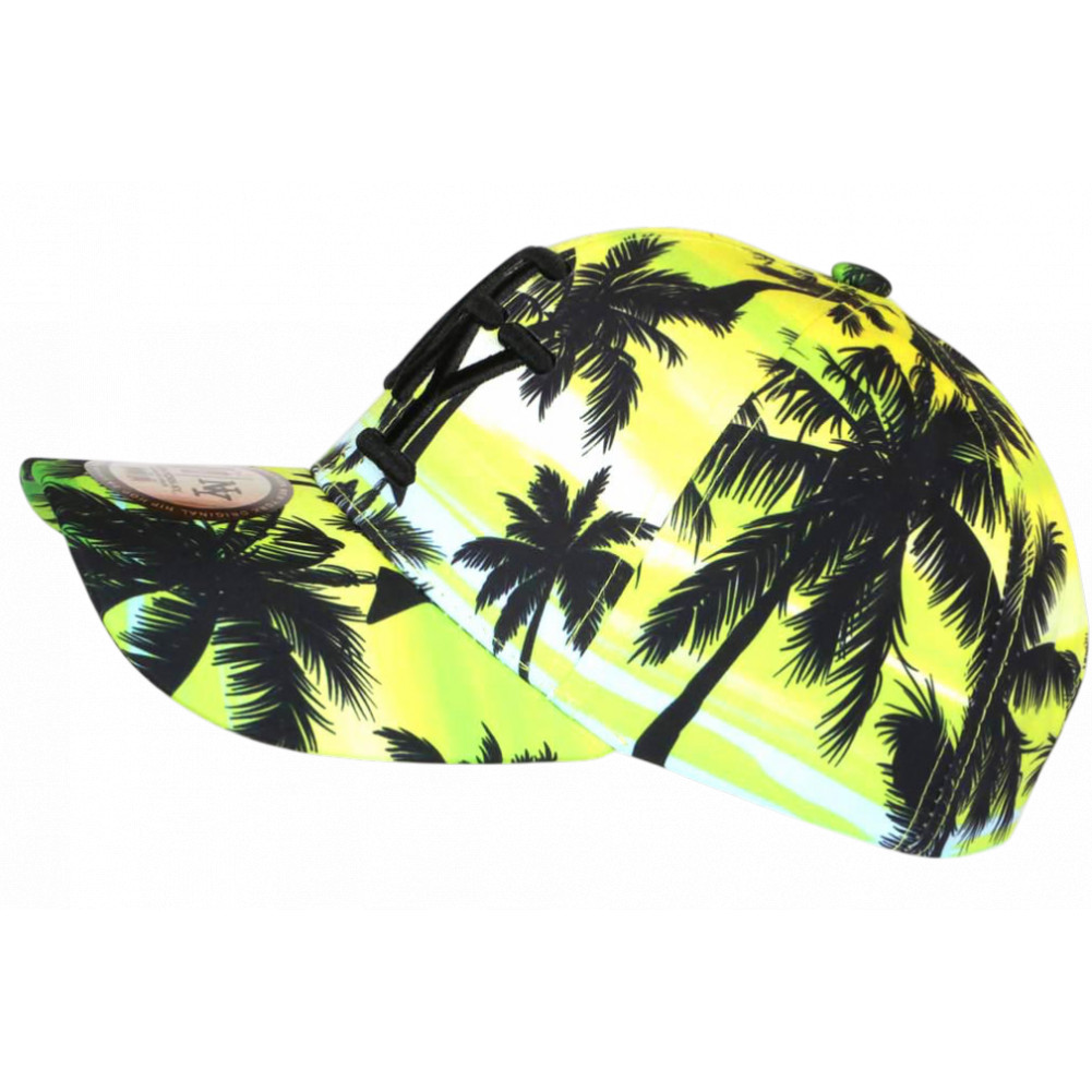 Achetez une casquette palmiers jaune et verte imprimé noir bord de mer Caraïbes modèle Hot Sunset de la marque Hip Hop Honour, casquette NY tropicale homme et femme originale et exotique ambiance plage, baignade et farniente cool, brodée NY noir brillant en 3D, visière baseball tendance, autocollant New York Original gris argent, taille réglable.