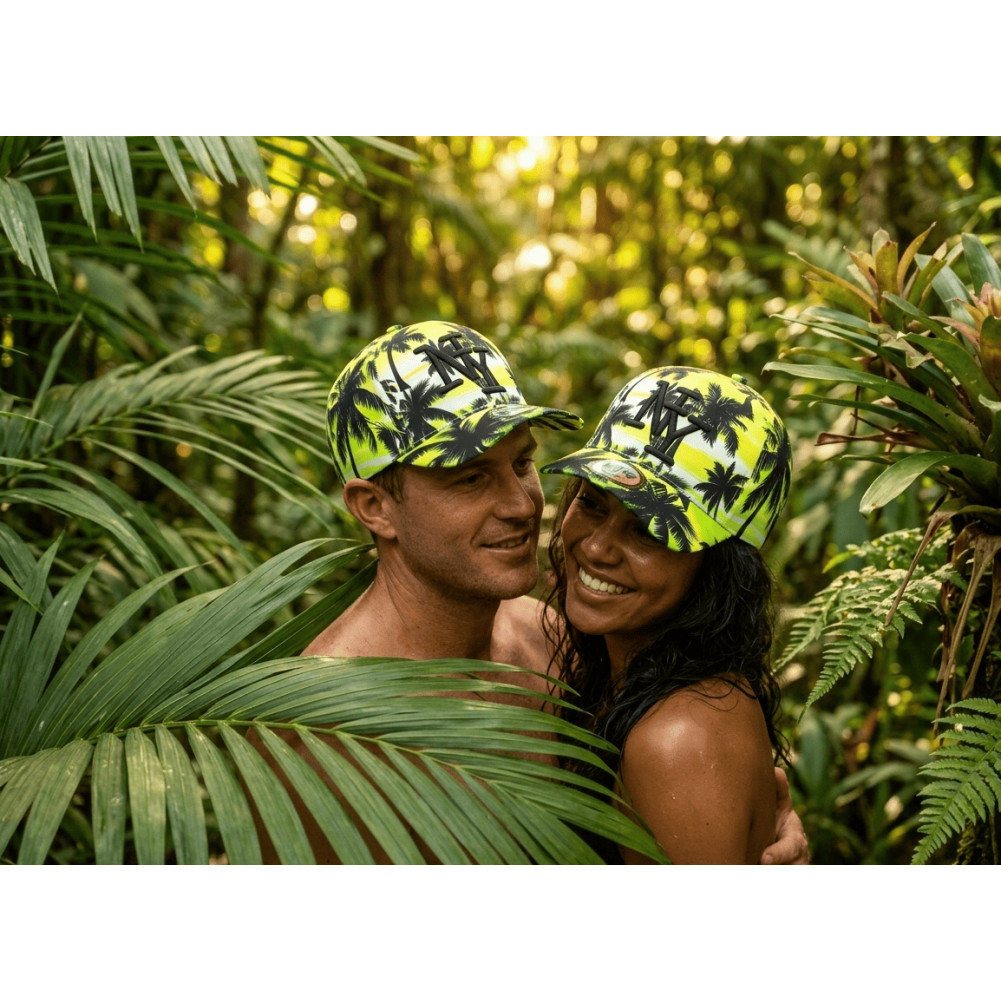 Offrez vous un style chaud et estival avec cette casquette NY palmier jaune, un modèle indispensable pour une allure streetwear tropicale moderne. Son fond dégradé aux nuances jaune, verte et blanche façon coucher de soleil assure une touche lumineuse et tendance, parfaitement équilibrée par les palmiers noirs contrastés.