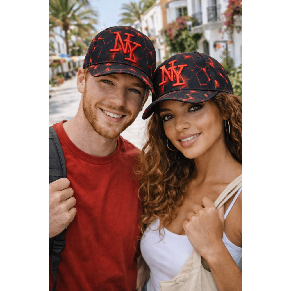 Le logo NY brodé sur l'avant rappelle l'identité iconique des casquettes New York style urbain, très présentes dans la culture streetwear et la mode hip hop. L'association entre ce symbole emblématique et le motif géométrique rouge donne à cette casquette un style à la fois moderne et urbain.