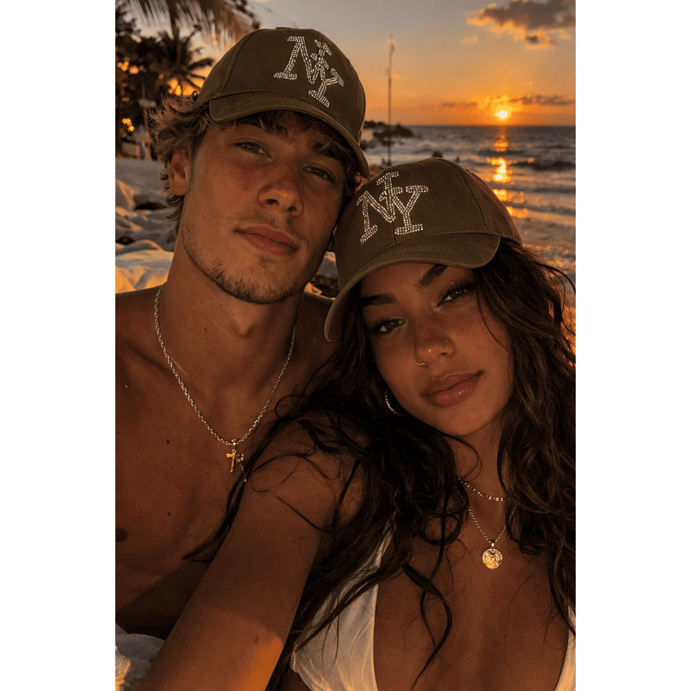 Cette casquette vert foncé tendance se distingue par sa couleur profonde et son logo NY décoré de strass lumineux. Le contraste entre le tissu vert et les strass apporte une finition élégante qui attire discrètement le regard.