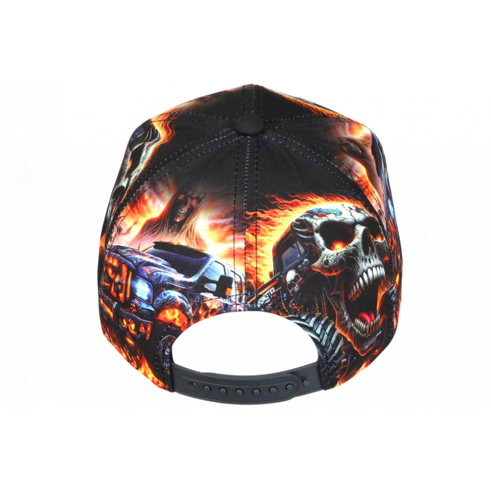 Affichez un style radical avec cette casquette NY tête de mort feu, un modèle au visuel explosif qui mélange univers mécanique, ambiance apocalyptique et esthétique streetwear. Le design met en scène une tête de mort agressive associée à un monster truck surpuissant, le tout plongé dans un décor enflammé aux tons rouges et orangés.