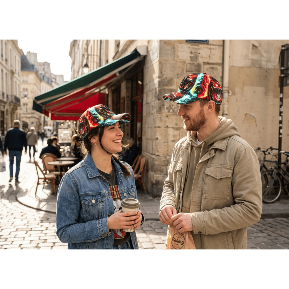 Affirmez un style visuel puissant avec cette casquette NY tête de mort flammes multicolore, un modèle qui se distingue par un design riche et dynamique. Le visuel met en scène un crâne stylisé entouré de flammes aux teintes rouges, jaunes et vertes, créant un effet de mouvement et de chaleur sur l’ensemble de la surface.