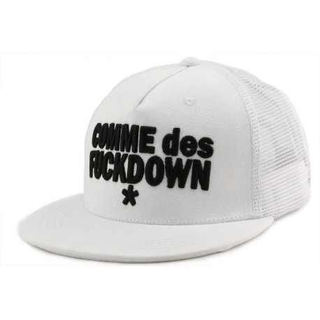 Casquette forme Trucker de la marque Comme des FuckDown; cette casquette est blanche avec une inscription sur le devant. A l'arrière il y a l'attache de réglage pour la taille.