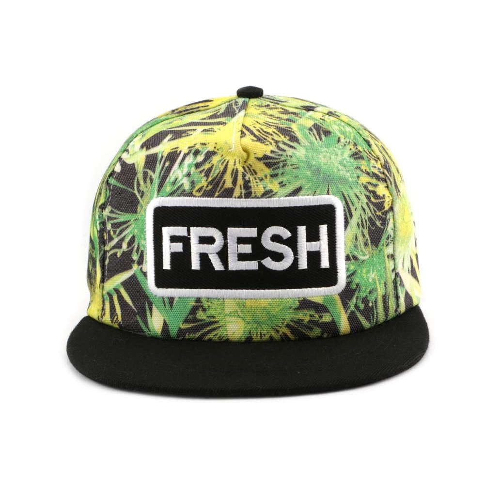 Casquette Snapback FRESH coloris Jaune Vert et Noir sélection Hip Hop Honor. Cette snapback est en tissu imprimé fond noir avec des motifs de grandes fleurs jaunes et vertes. La visière de la casqeutte est en tissu uni noir. Sur le top logo Fresh est brodé blanc sur fond brodé noir, encadré blanc.