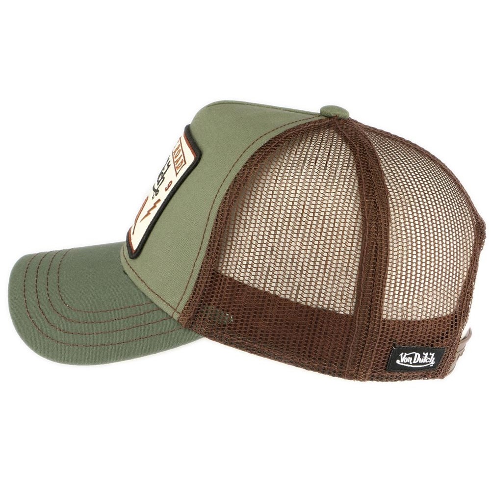 Surveillé par l'oeil ailé de l'artiste Kustom Kultur Kenneth Howard, cette casquette marque Von Dutch référence Electric Road est en coton vert olive avec un filet trucker marron chocolat. Look pinstripping des années 50 avec le mouvement de contre culture américaine, cette casquette trucker épurée rassemble le savoir faire du célèbre peintre sur un patch Von Dutch beige brodé du flying Eyeball surmonté du logo Electric Road. La visière baseball est verte avec surpiqures chocolat, le dessous est vert clair tilleuil.