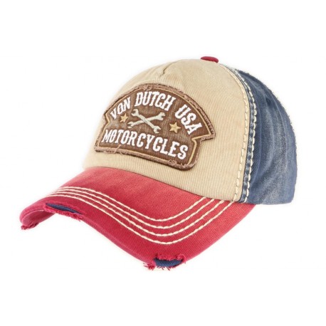 Style Kustom Kultur avec une belle ambiance garage dans d'esprit de Kenneth Howard, cette casquette de marque Von Dutch modèle Dylan bleu motorcycles est en toile de coton avec un top bicolore beige et bleu aux grosses surpiqures facon baseball et la visière rouge élimée laissant apparaitre un tissu bleu. Esprit vieilli et destroy de la contre culture USA des années 50, cette casquette americaine retro est agrémentée d'un patch marron brodé Von Dutch motorcycles et d'une croix en clefs à molettes look hot road.